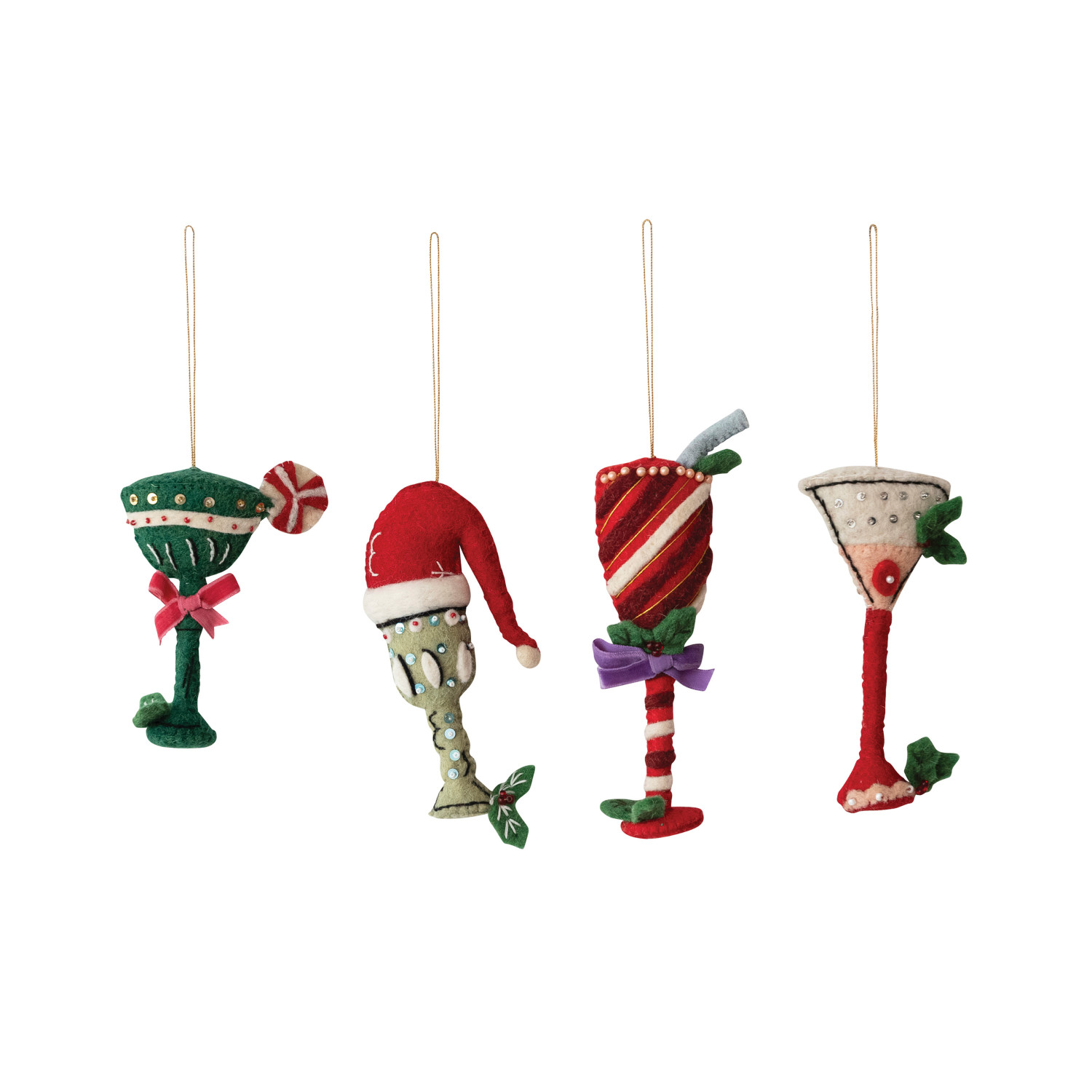 Handmade Wool Felt Holiday Cocktail Ornament with Embroidery, Sequins & Beads, 4 Styles ©