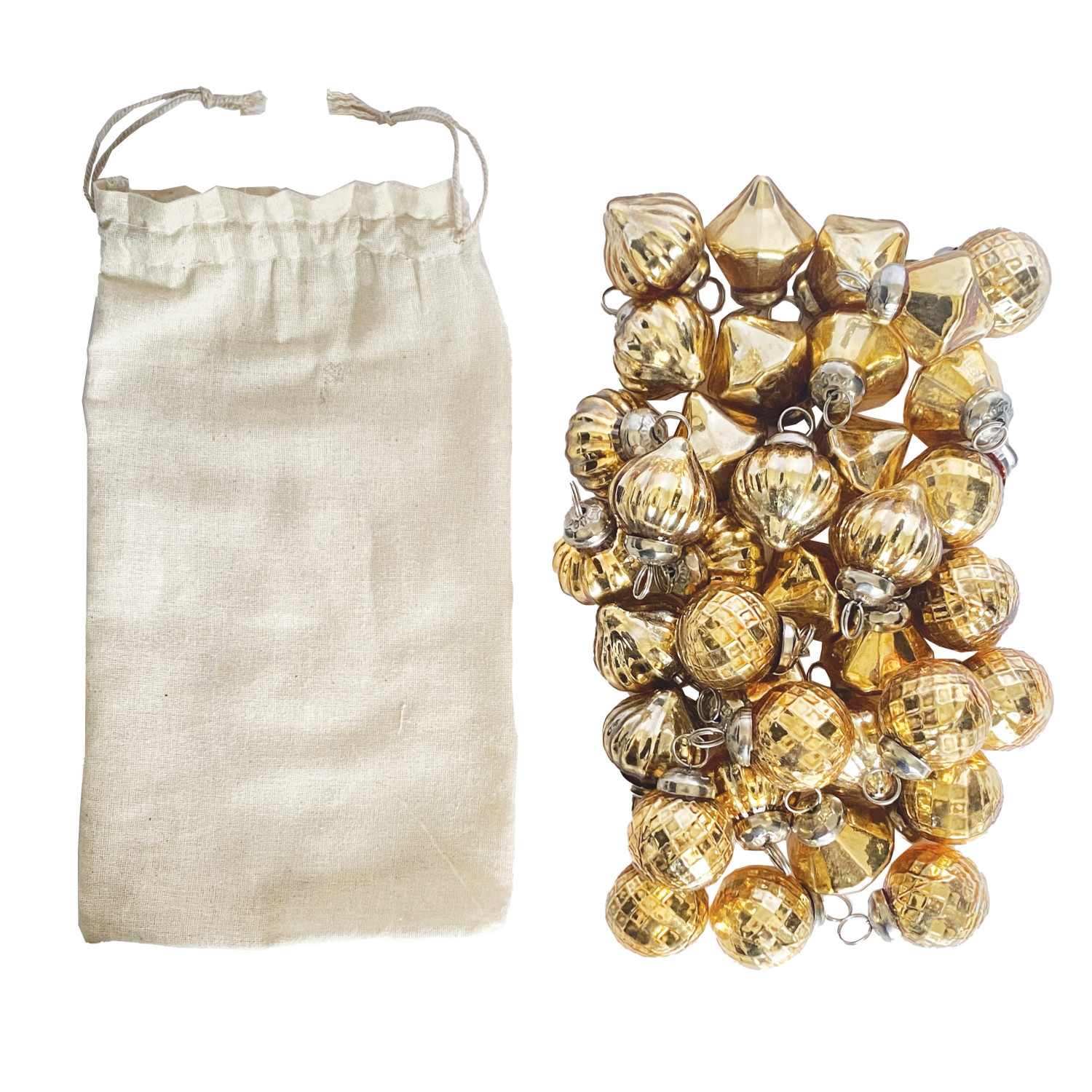 Embossed Mercury Glass Ornaments in Muslin Bag, Gold Finish, Set of 36