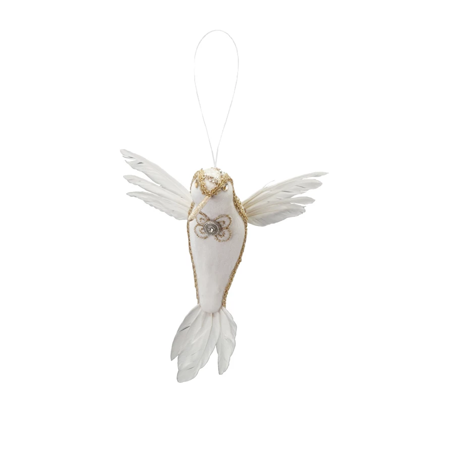 Catalog Name: 7-1/2"H Fabric & Foam Hummingbird Ornament w/ Feathers & Jewels, White & Gold Finish