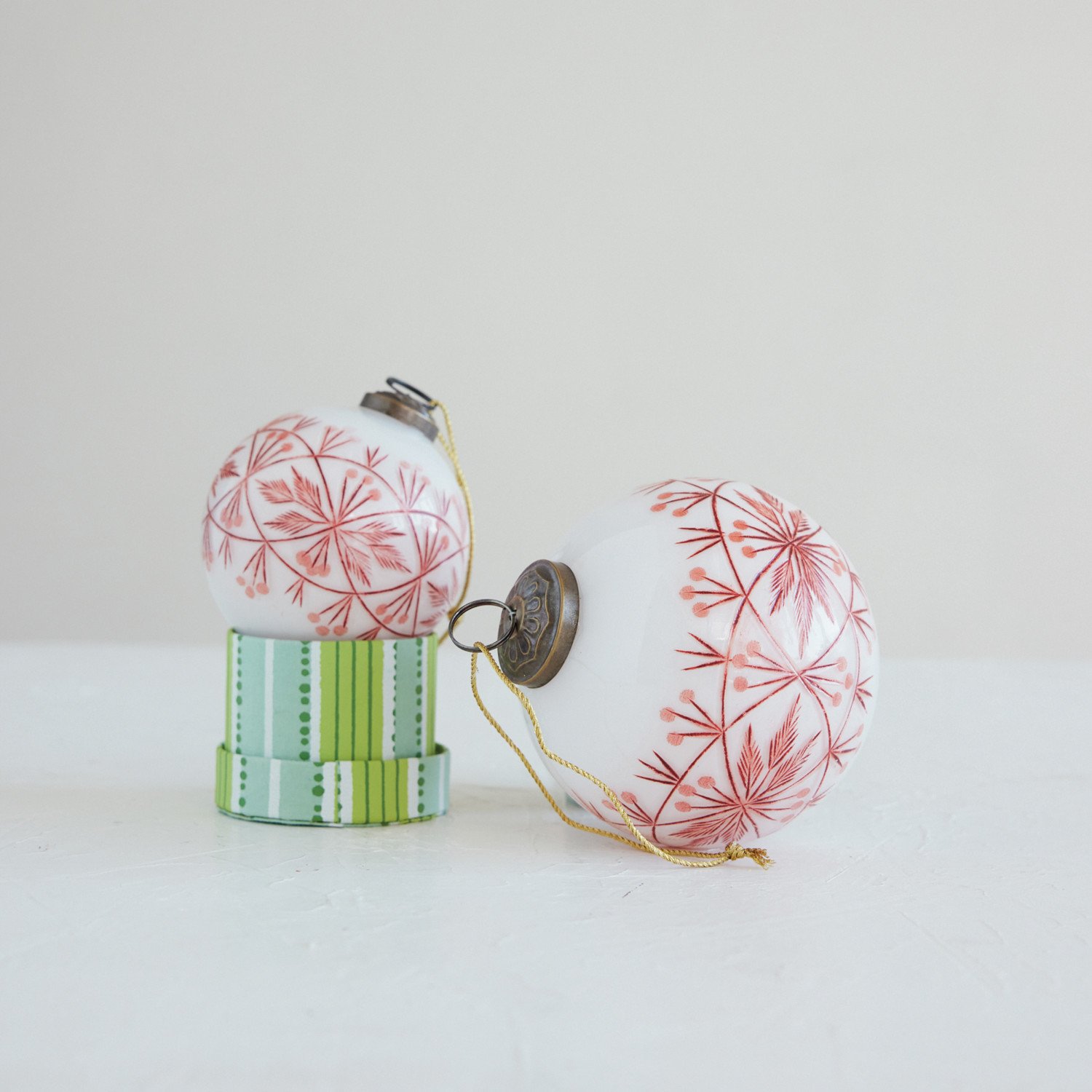 Hand-Blown Etched Glass Ball Ornament with Design, White & Red