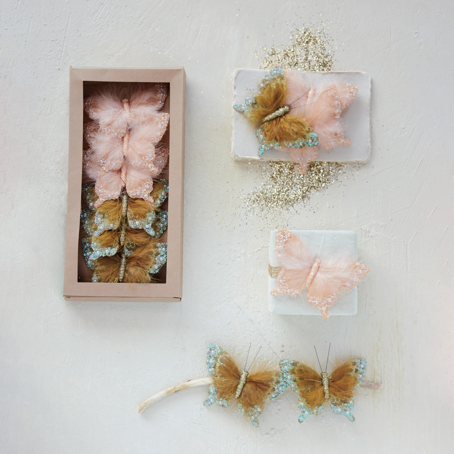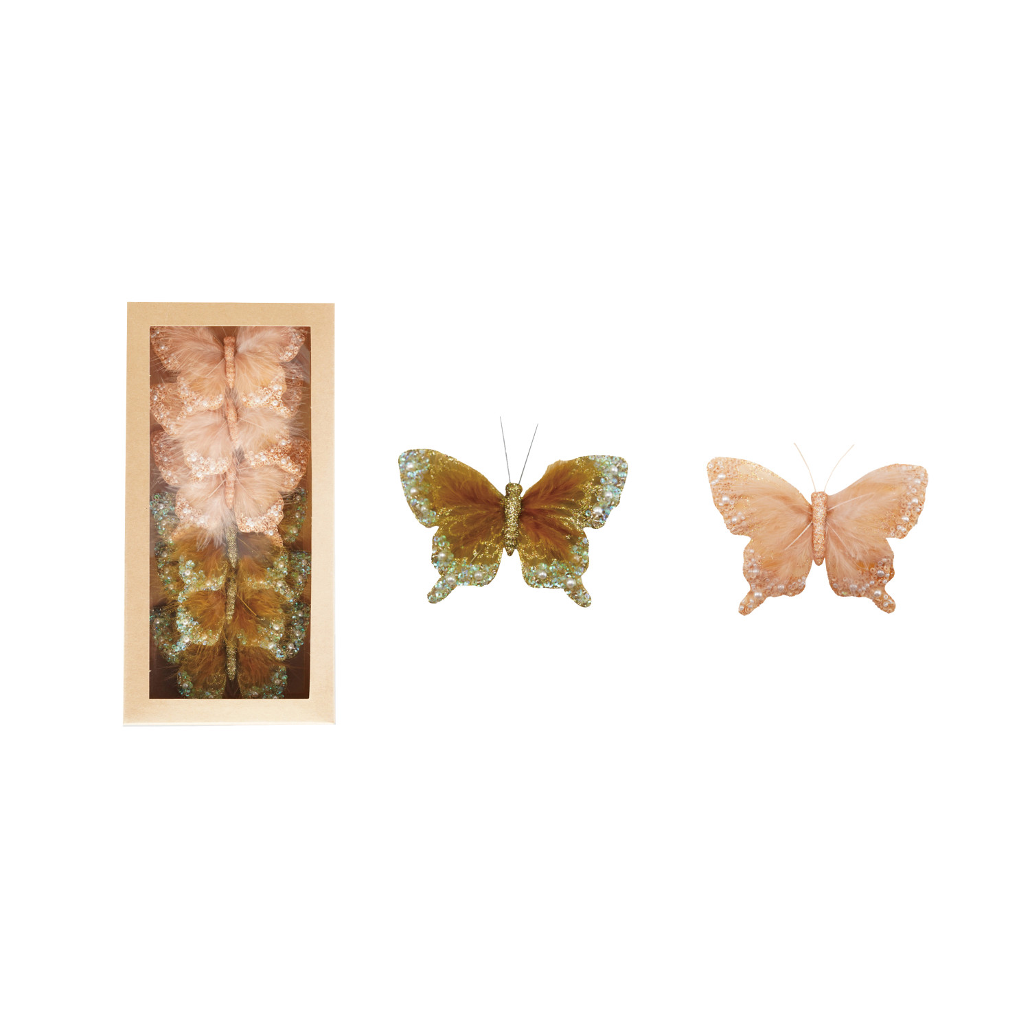 Feather Butterfly Clip-on Ornaments with Faux Pearls, Beads & Glitter, Boxed Set of 6