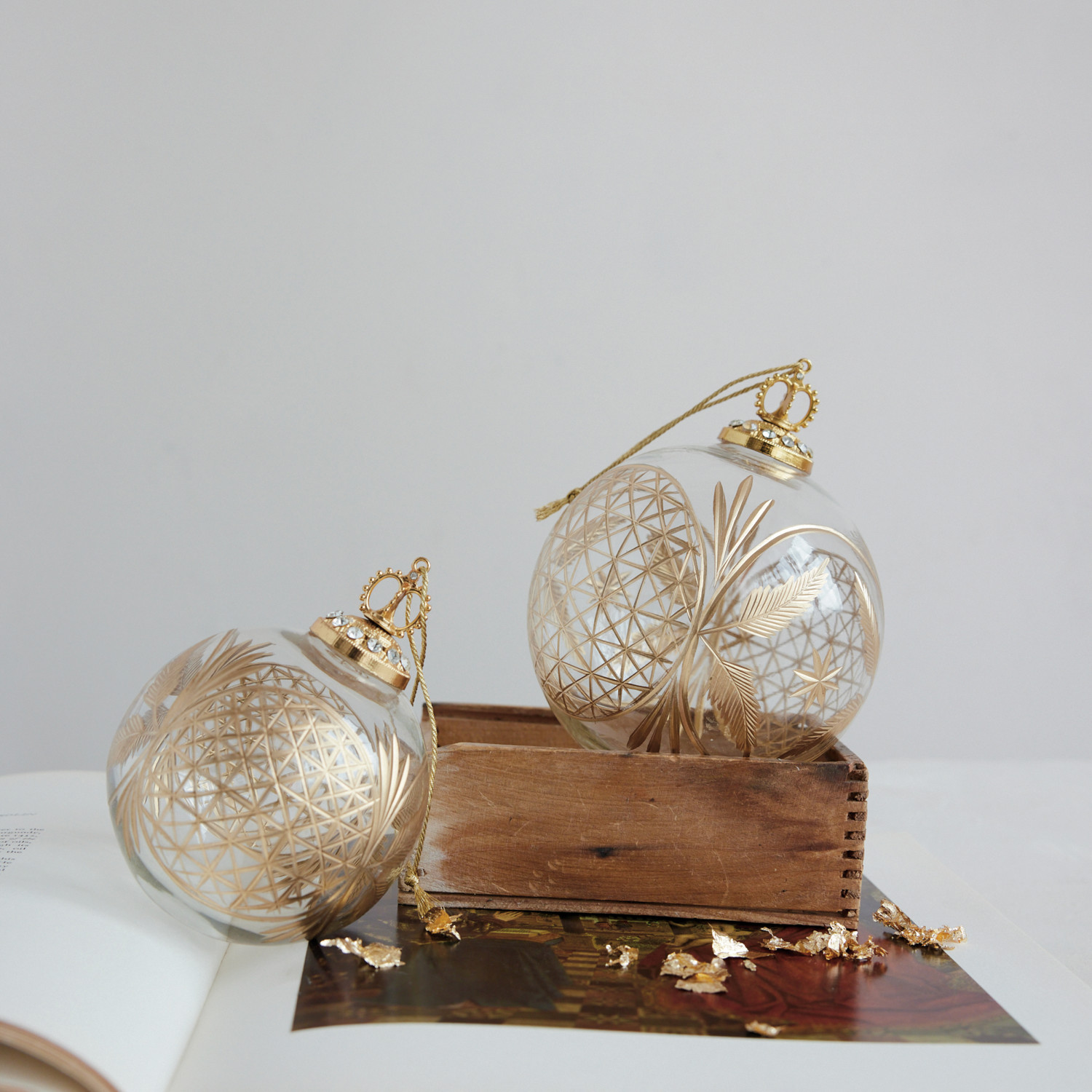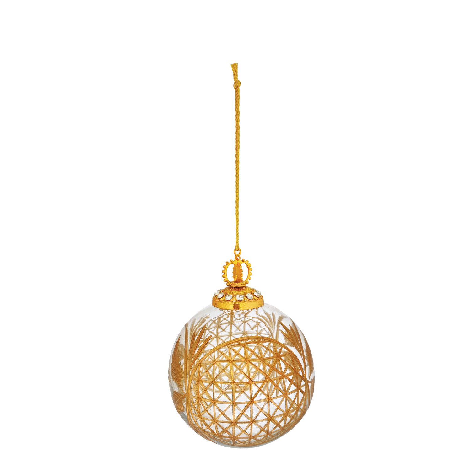 Hand-Blown Etched Glass Ball Ornament with Design, Gold Finish
