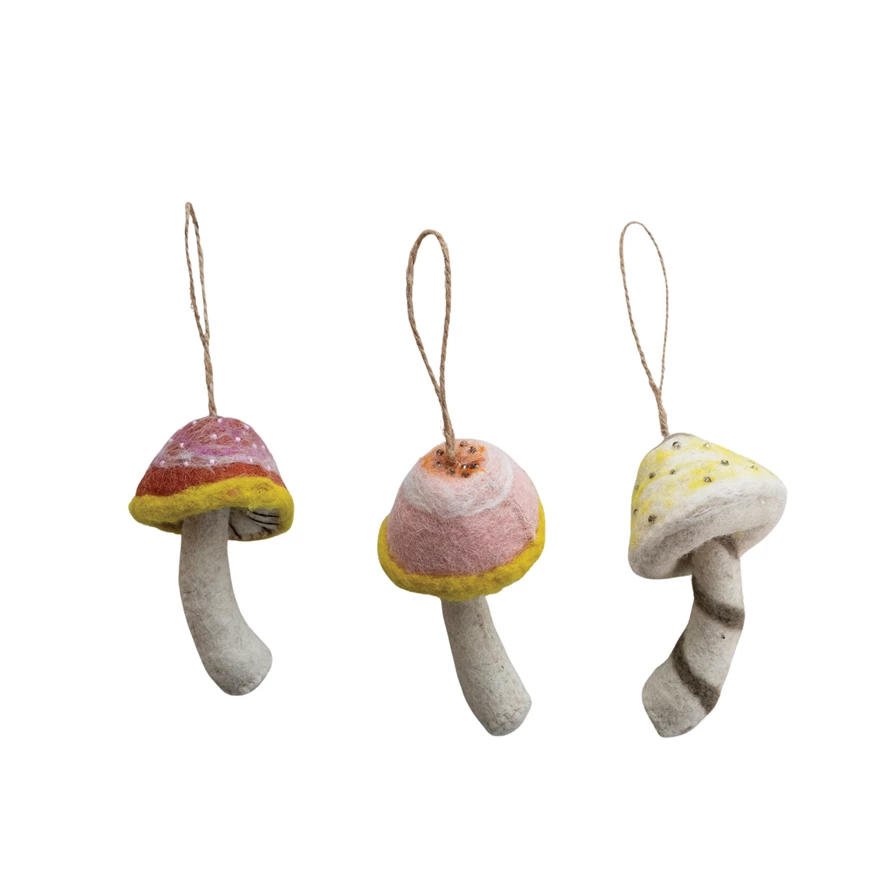 Catalog Name: 5"H Handmade Wool Felt Mushroom Ornament w/ Embroidery & Beads, Multi Color, 3 Styles