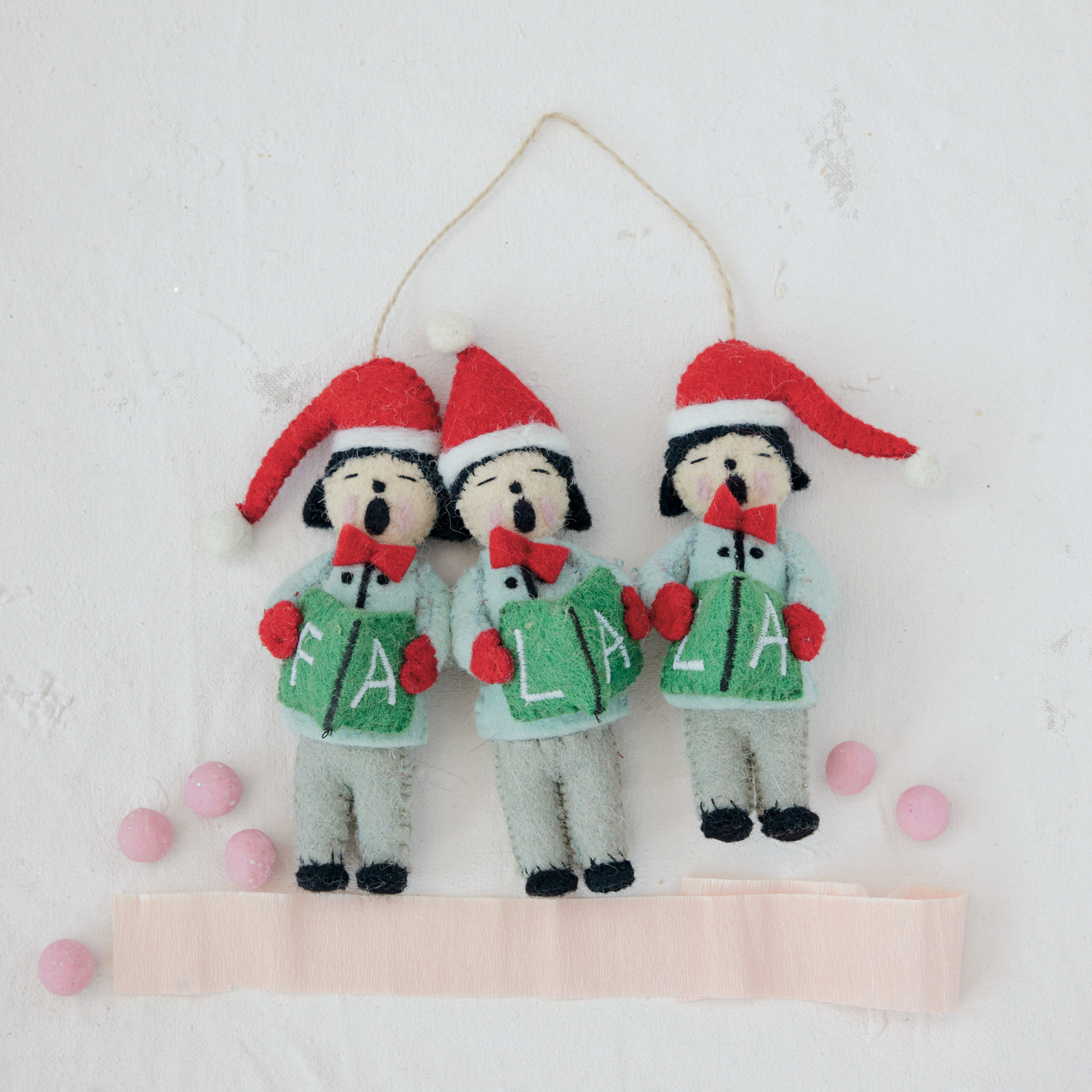 Wool Felt Carolers in Santa Hats Ornament "Fa La La" ©