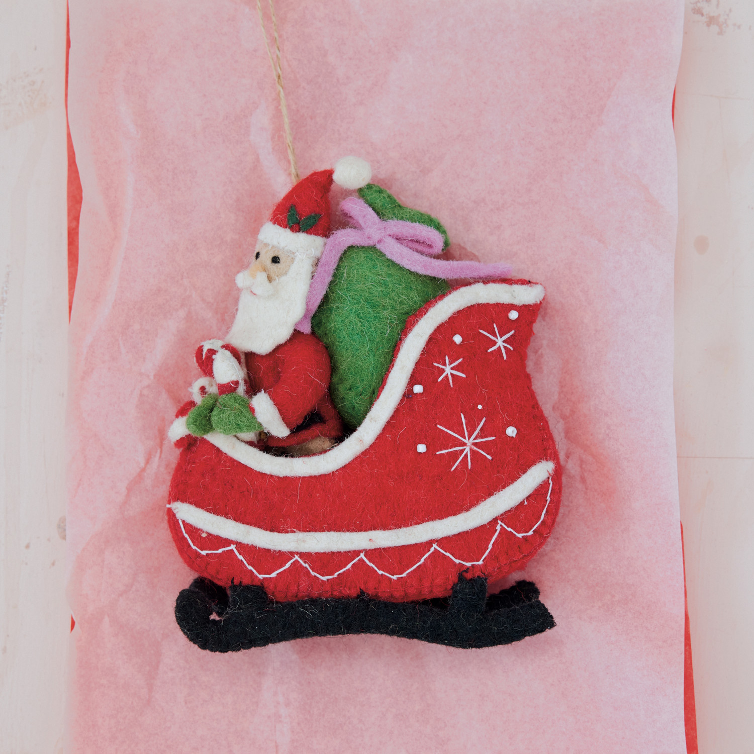 Wool Felt Santa in Sleigh Ornament with Embroidery & Beads ©