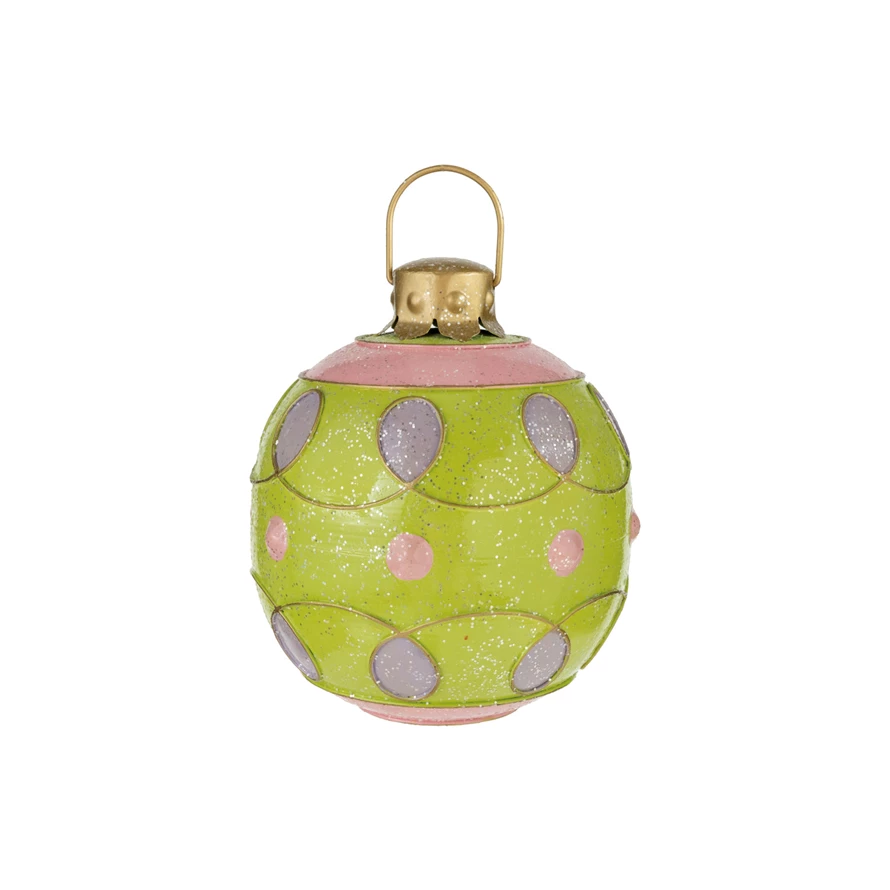 Oversized Painted Metal Ball Ornament with Pattern & Glitter, Green, Pink & Purple