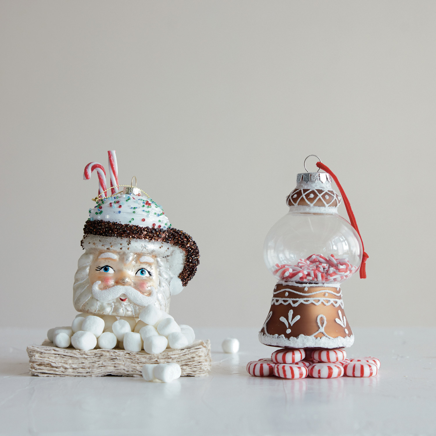 Catalog Name: 4-3/4"H Hand-Painted Glass Gingerbread Candy Machine Ornament w/ Candy Inside & Glitter, Brown, White & Red