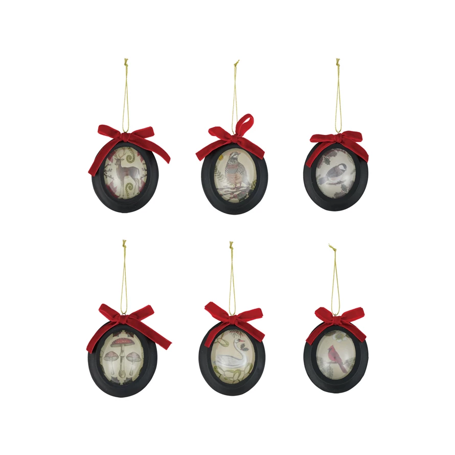 Catalog Name: 3-1/2"H Convex Resin Framed Ornament w/ Seasonal Botanicals, Animal & Burgundy Velvet Bow, 6 Styles ©