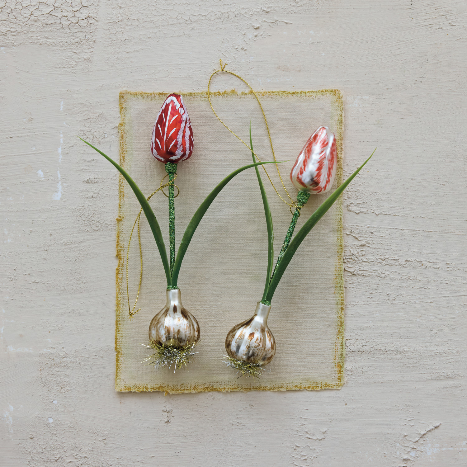 Catalog Name: 8"H Hand-Painted Mercury Glass Tulip Bulb Ornament w/ Faux Leaves & Glitter, 2 Styles
