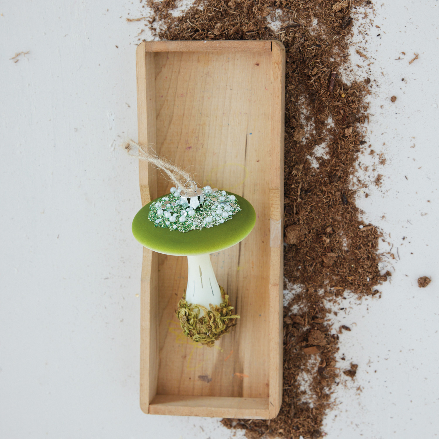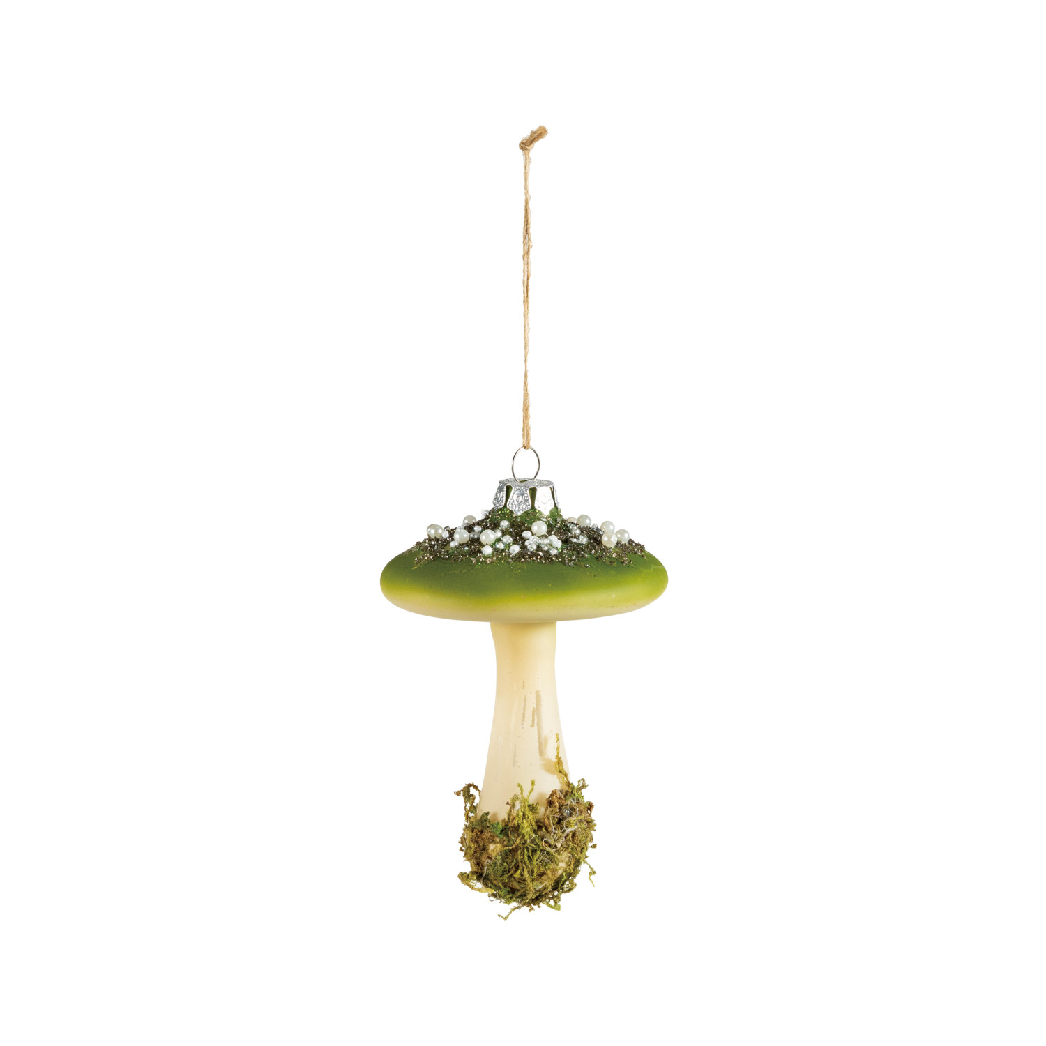 Hand-Painted Glass Mushroom Ornament with Moss, Beads & Glitter, Green & White