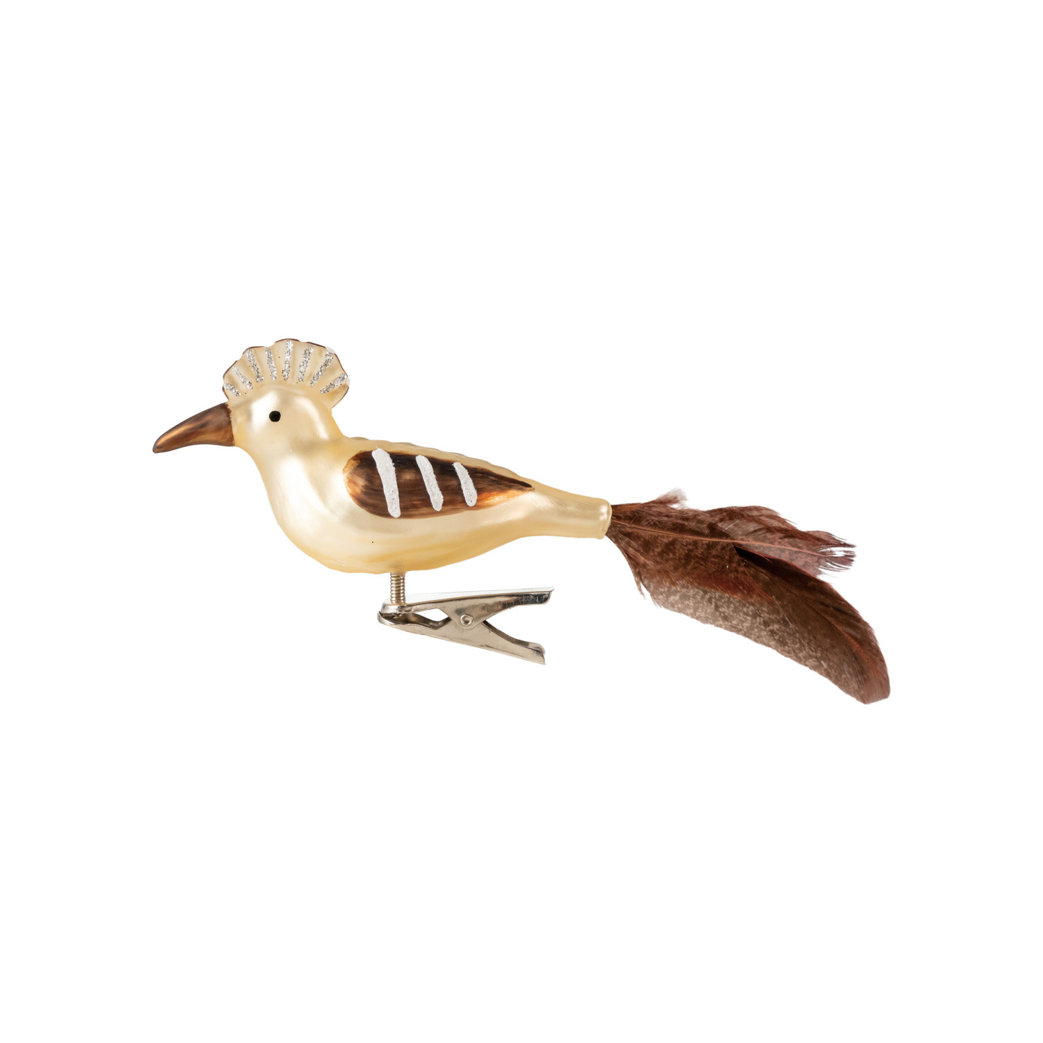 Catalog Name: 4-3/4"L x 2-1/2"H Hand-Painted Mercury Glass Clip-on Hoopoe Bird Ornament w/ Glitter & Faux Feather, Brown & White