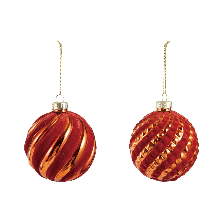 Catalog Name: 3" Round Glass Ball Ornament w/ Flocked Stripes, Burgundy & Copper Finish, 2 Styles