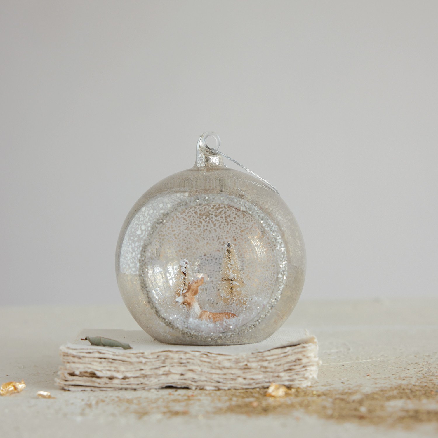 Catalog Name: 4" Round Mercury Glass Diorama Ornament w/ Deer, Bottle Brush Trees & Glitter, Silver Finish, Beige & White
