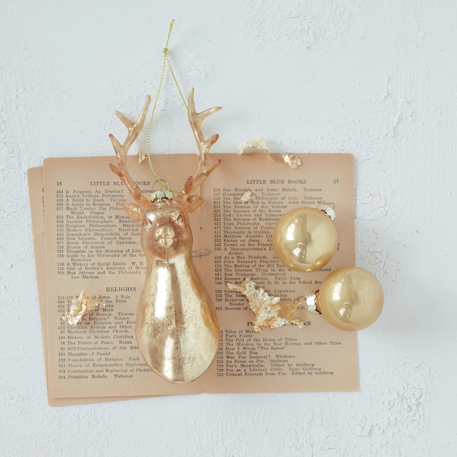 Catalog Name: 6"H Mercury Glass Deer Head Ornament, Gold Finish