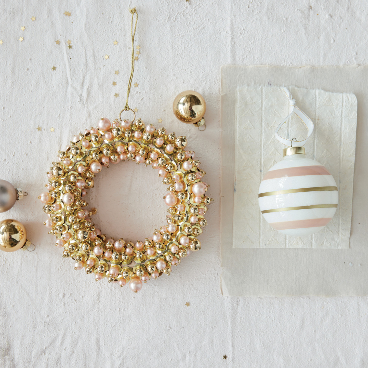 Glass Striped Ball Ornament, Gold Finish, White & Pink