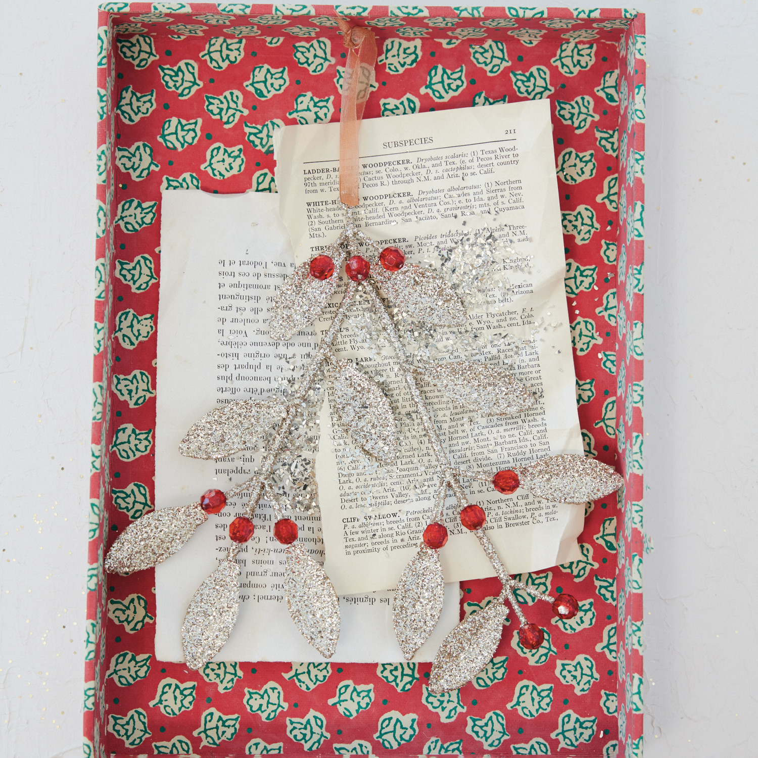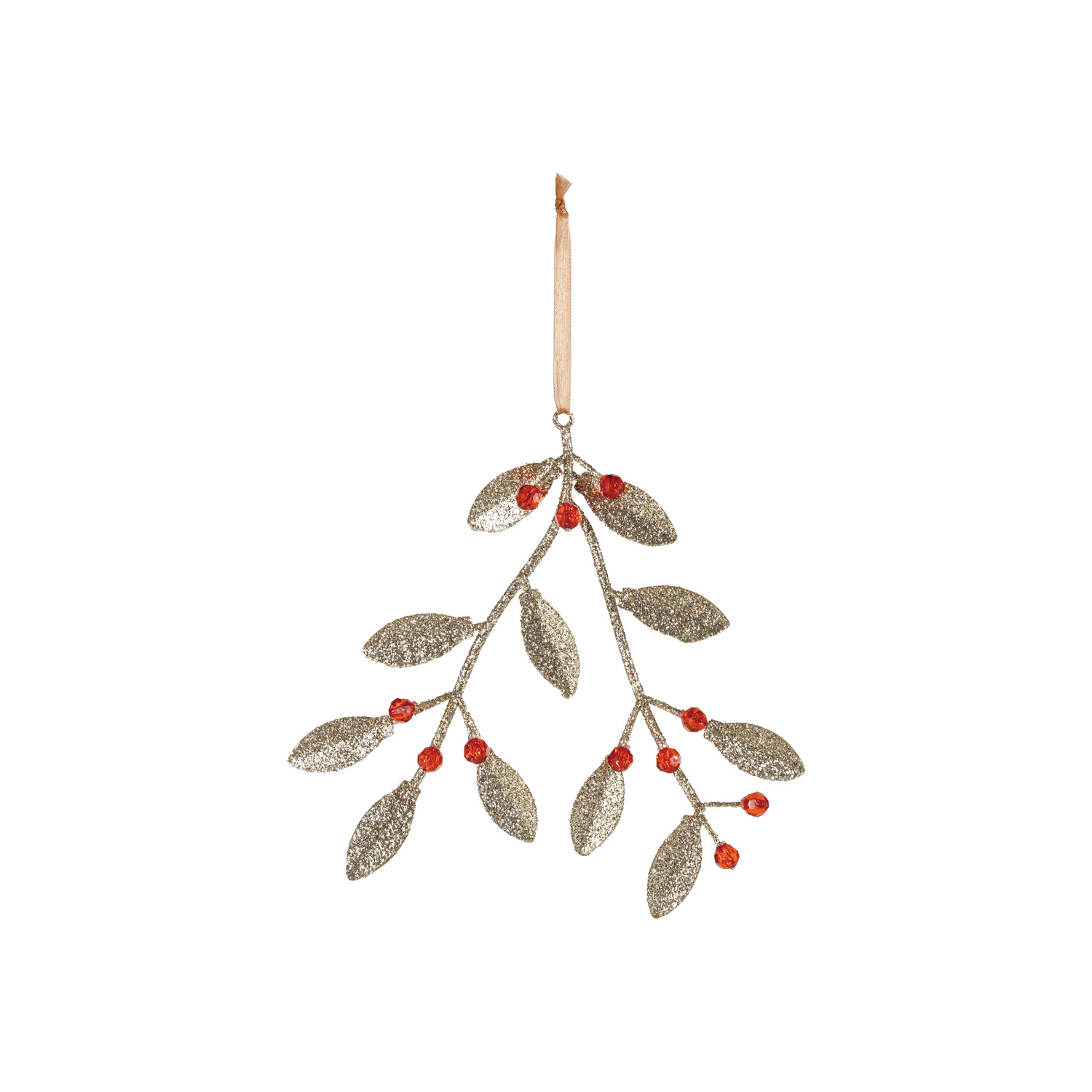 Catalog Name: 8"L x 7-1/2"H Metal & Plastic Bead Mistletoe Ornament w/ Glitter, Gold Finish & Red