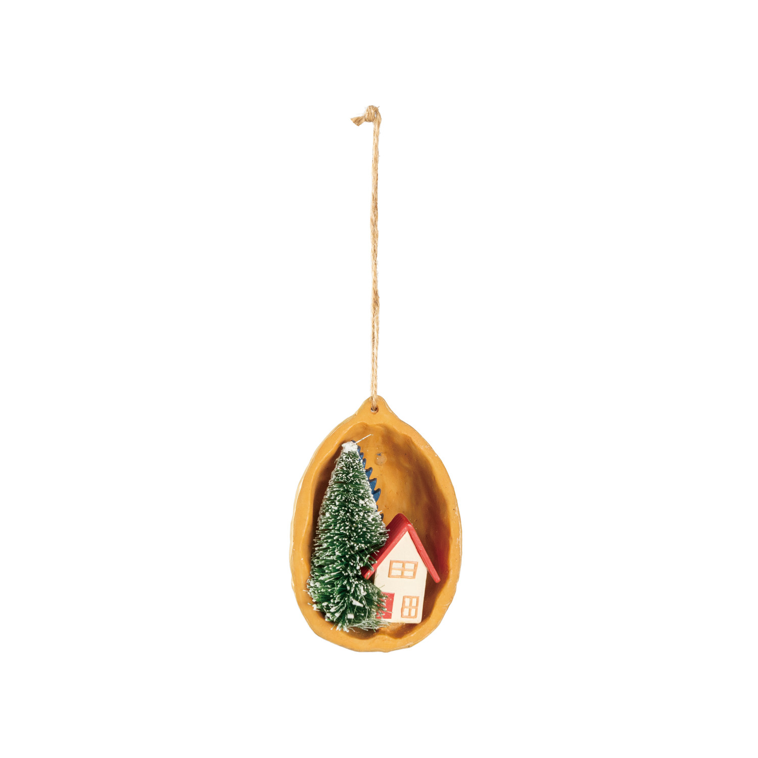 Resin Walnut Half Shell Diorama Ornament with House & Sisal Bottle Brush Tree