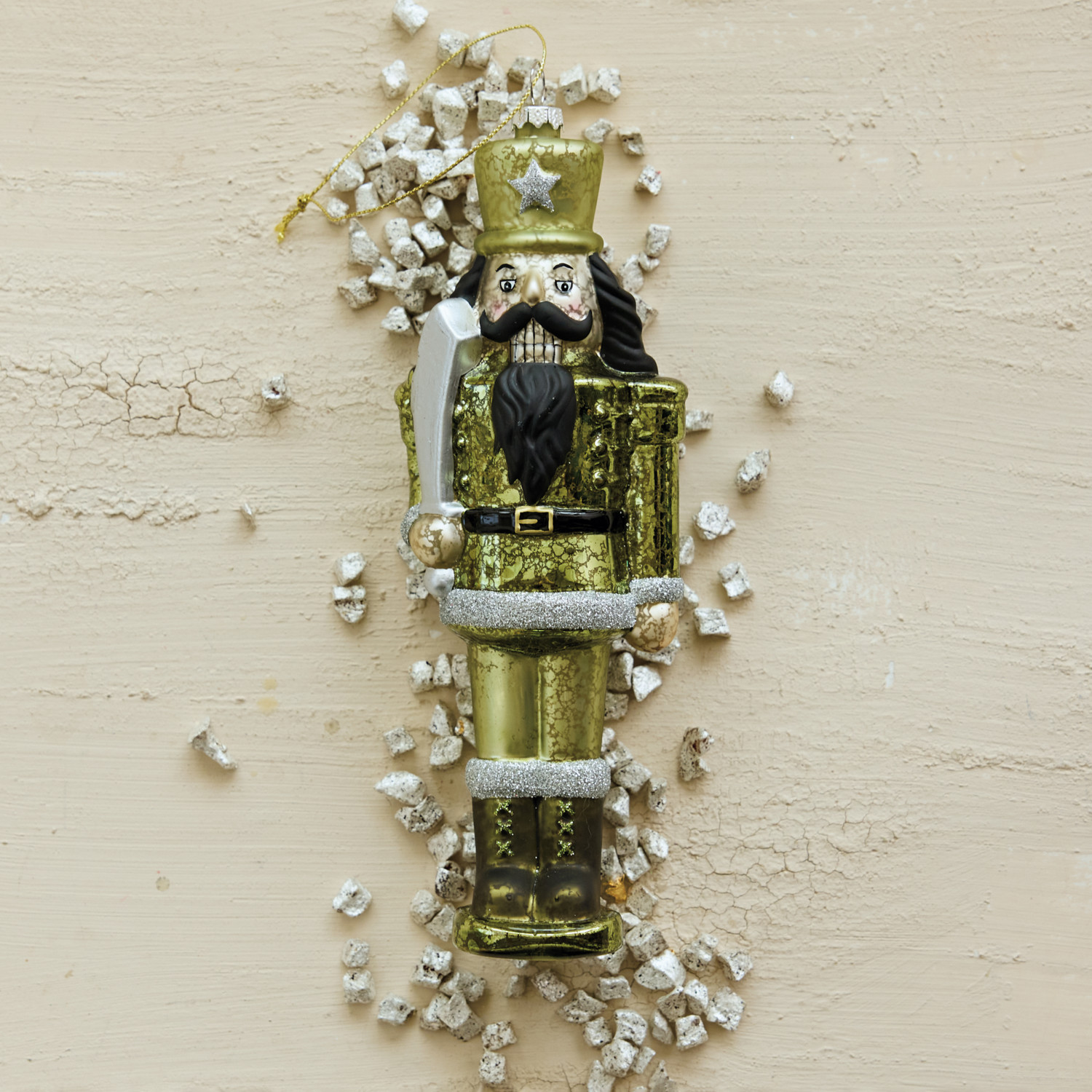Glass Soldier Ornament with Glitter, Silver Finish & Green ©