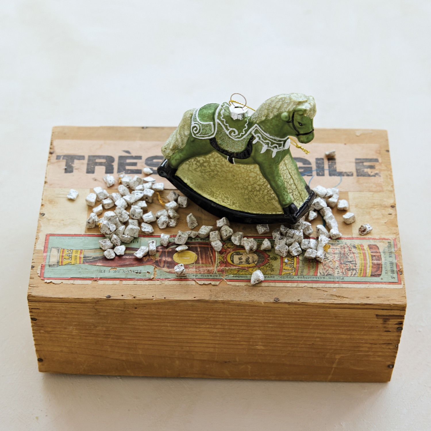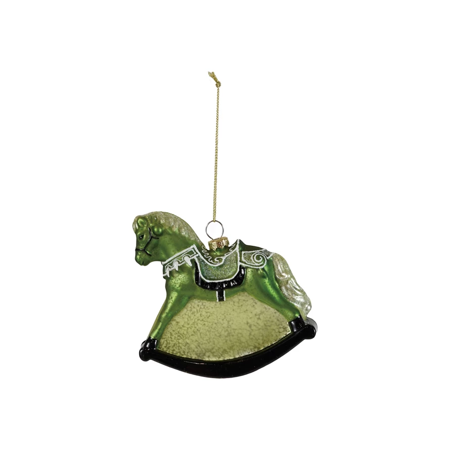 Catalog Name: 4"H Glass Rocking Horse Ornament w/ Glitter, Green & Cream Color ©