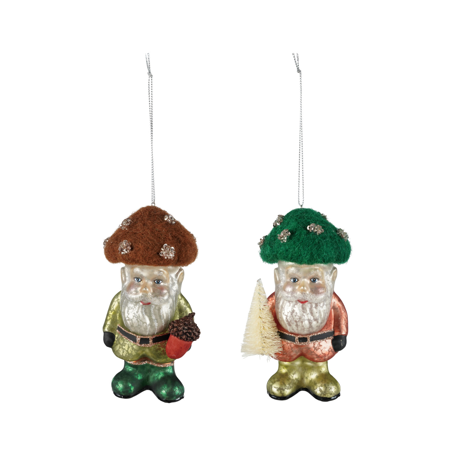 Catalog Name: 4-3/4"H Hand-Painted Mercury Glass Gnome Ornament w/ Wool Felt Mushroom Hat, Acorn/Tree & Glitter, Multi Color, 2 Styles
