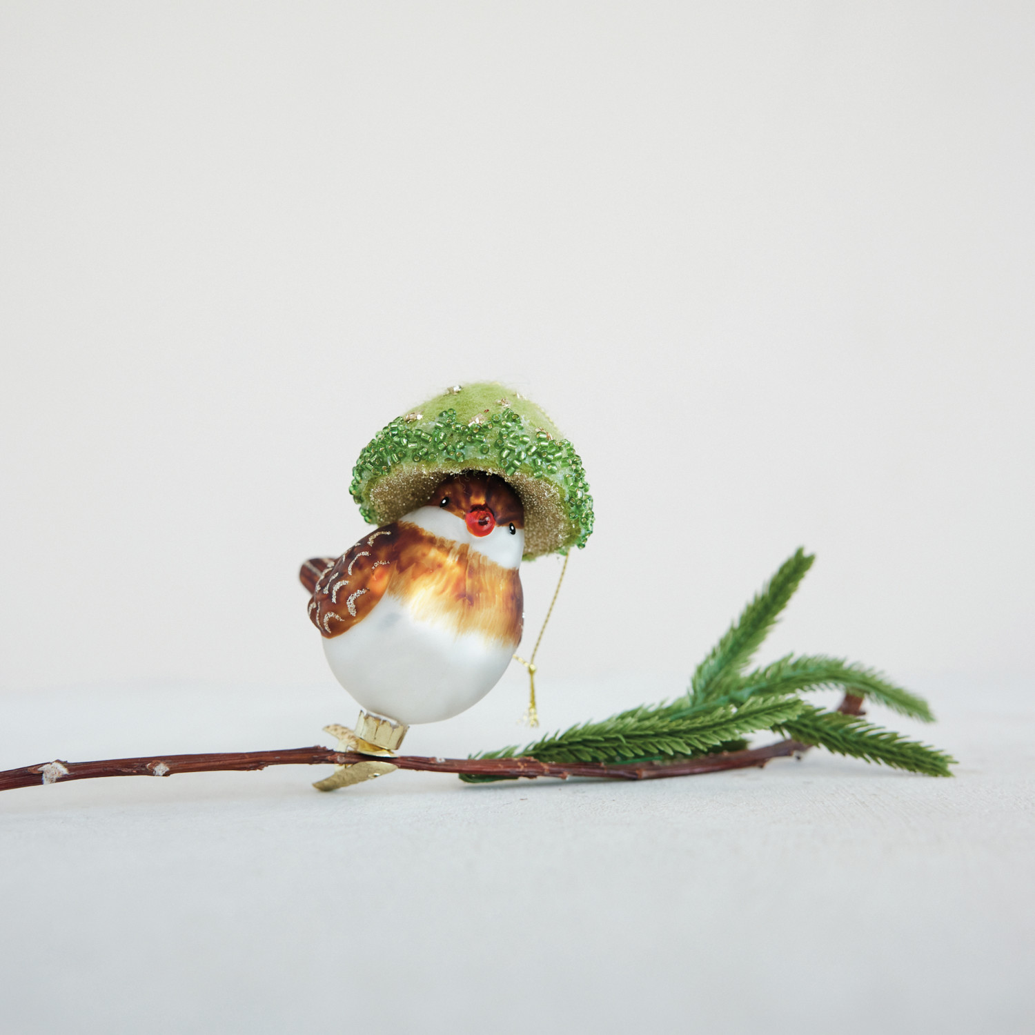 Catalog Name: 3-1/2"H Hand-Painted Glass Bird Clip-on Ornament w/ Wool Felt Mushroom Hat, Beads & Glitter, Multi Color