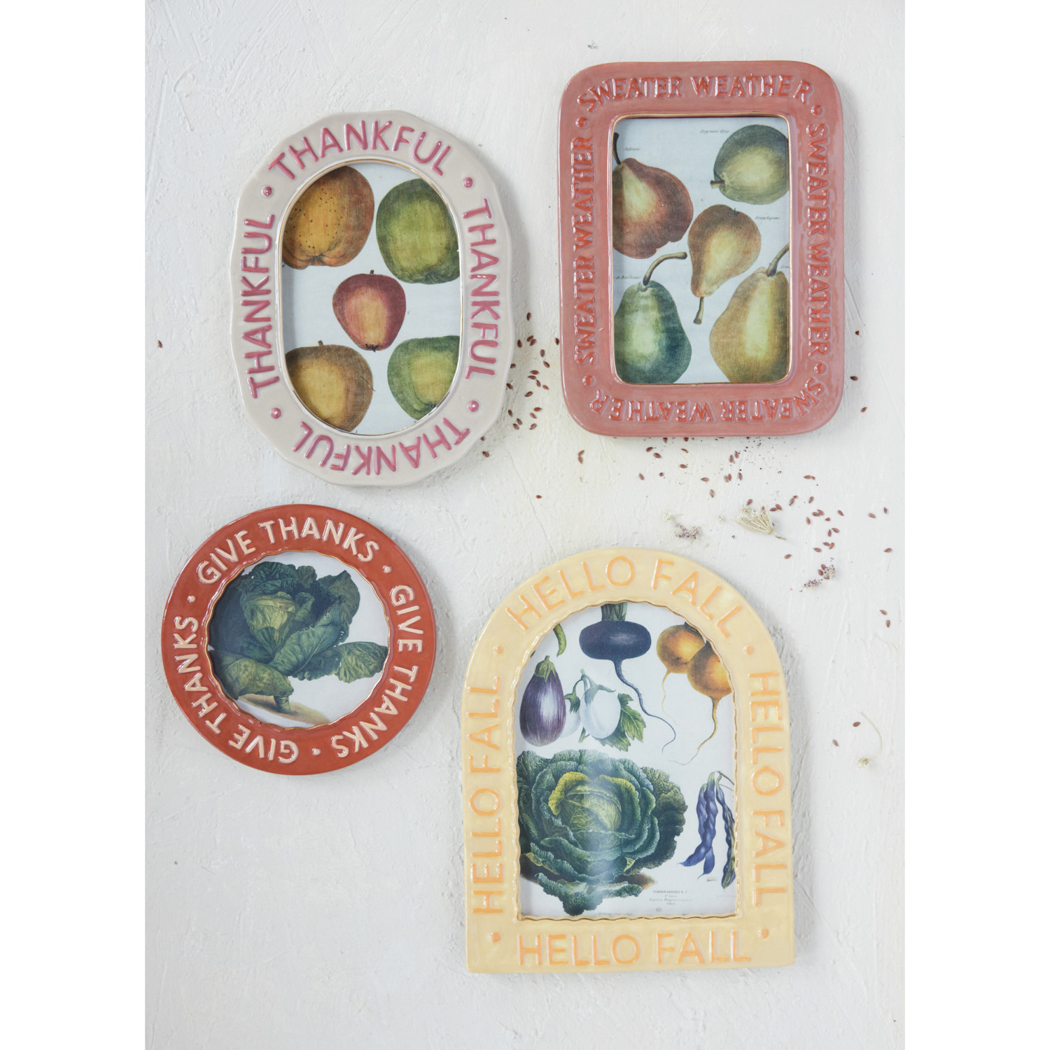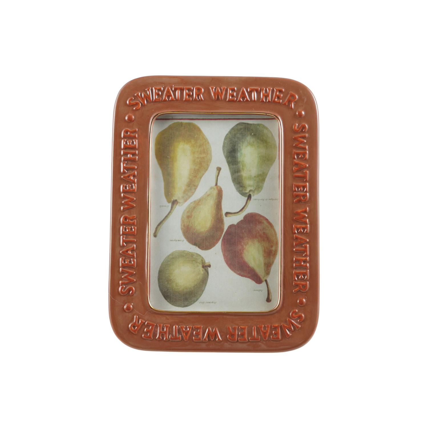 Catalog Name: 6"W x 8"H Hand-Painted Embossed Stoneware Photo Frame "Sweater Weather", Rust Color (Holds 4" x 6" Photo)