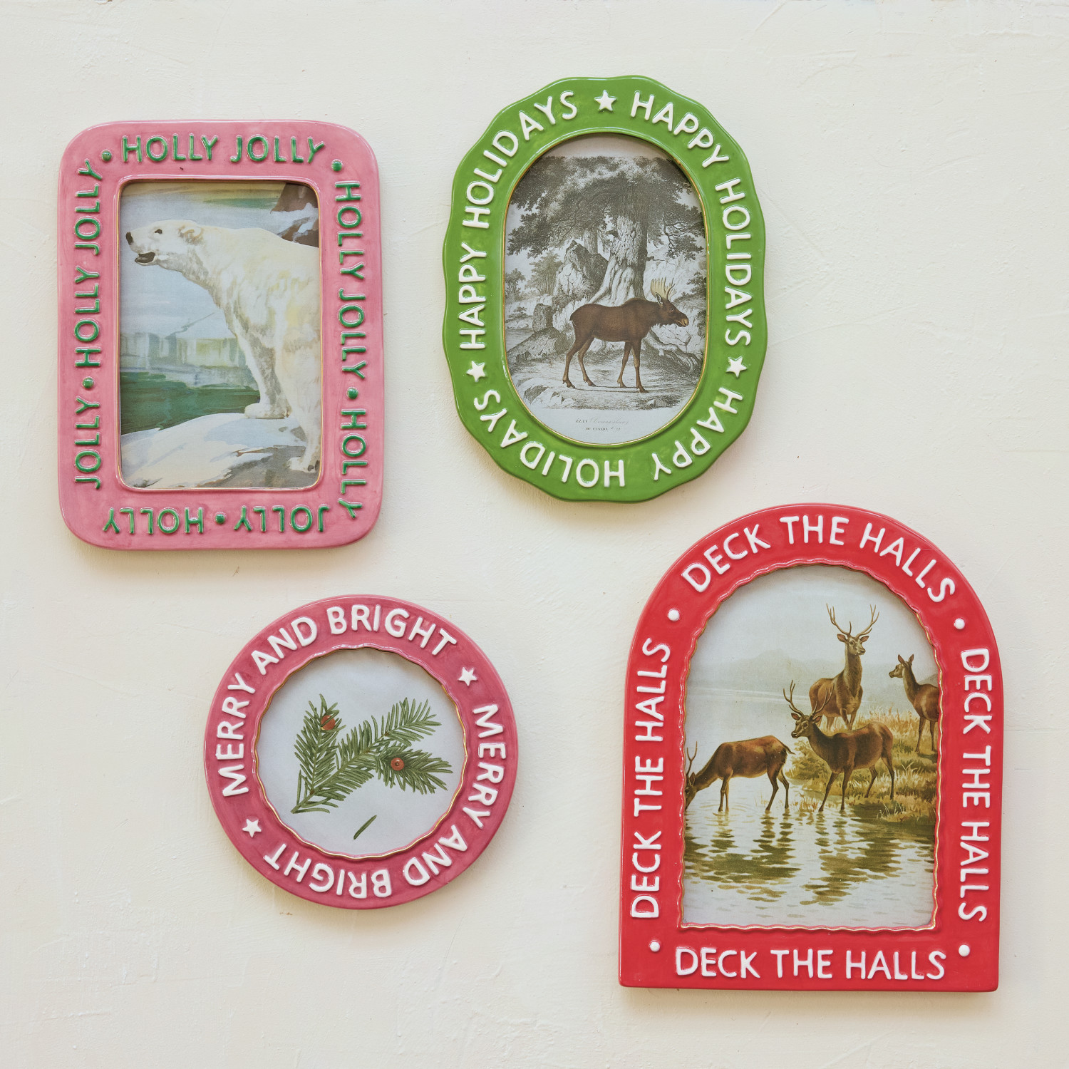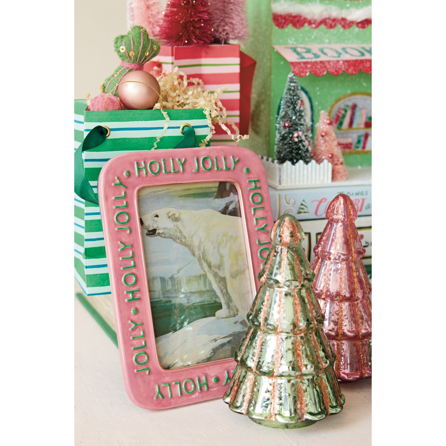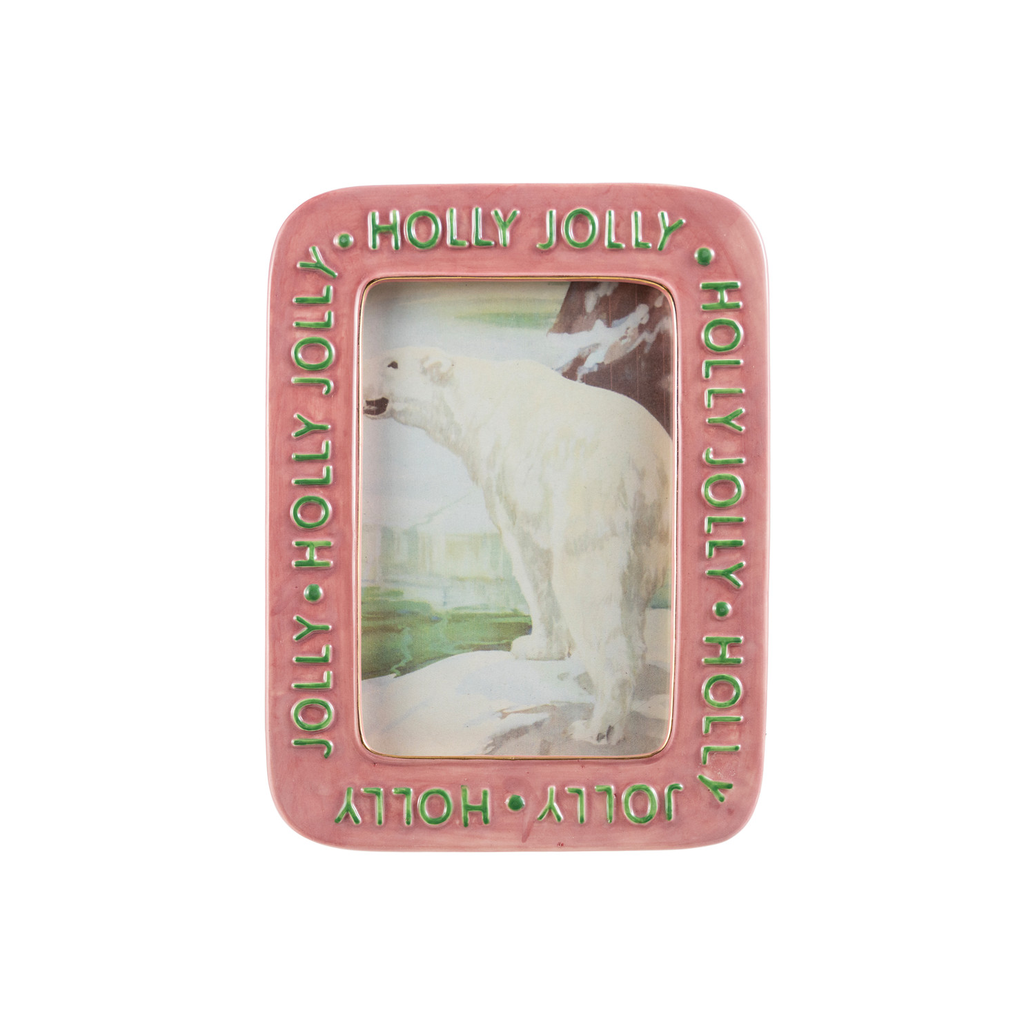 Catalog Name: 6"W x 8"H Hand-Painted Embossed Stoneware Photo Frame "Holly Jolly", Pink & Green (Holds 4" x 6" Photo)
