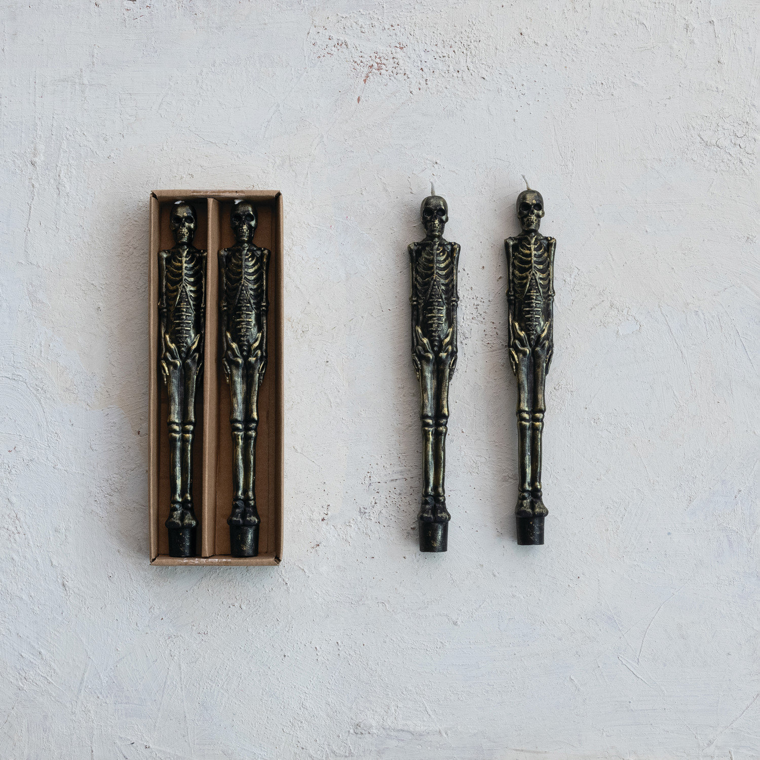 Catalog Name: 10"H Unscented Skeleton Shaped Taper Candles in Box, Black & Gold Color, Set of 2 (Est. Burn Time 7 Hours)