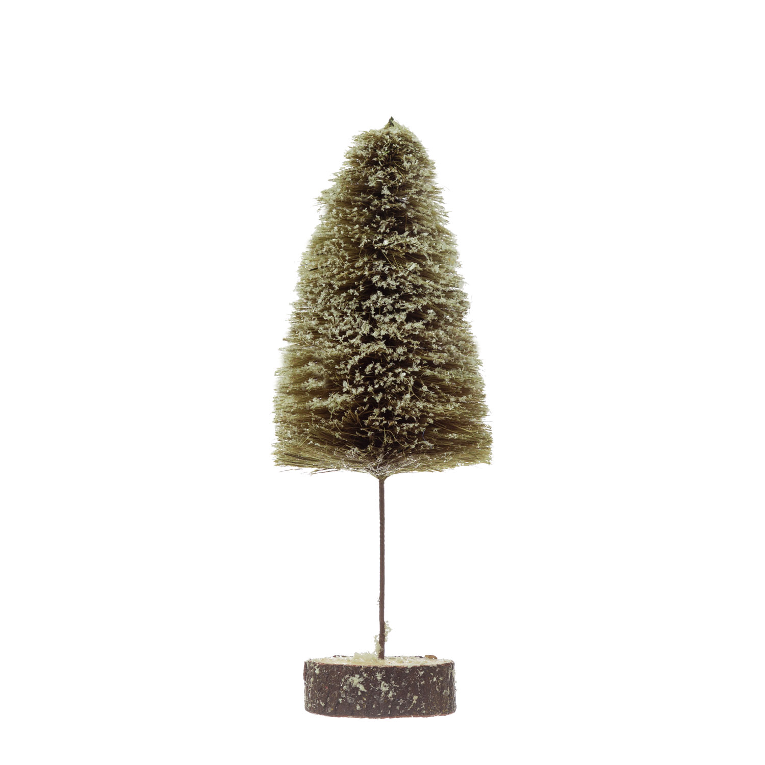 Catalog Name: 4-1/4" Round x 12-1/2"H Sisal Bottle Brush Tree with Wood Slice Base, Snow Finish, Green