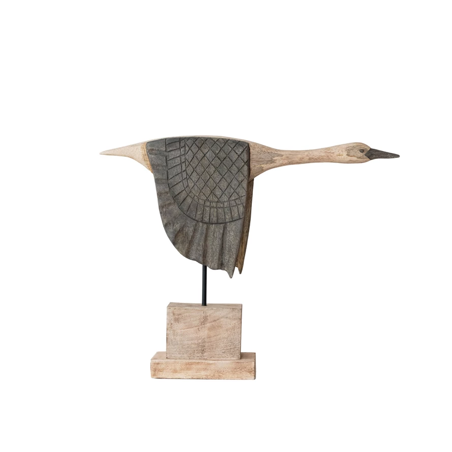 Hand-Carved Mango Wood & Metal Goose on Stand, Natural & Bleached