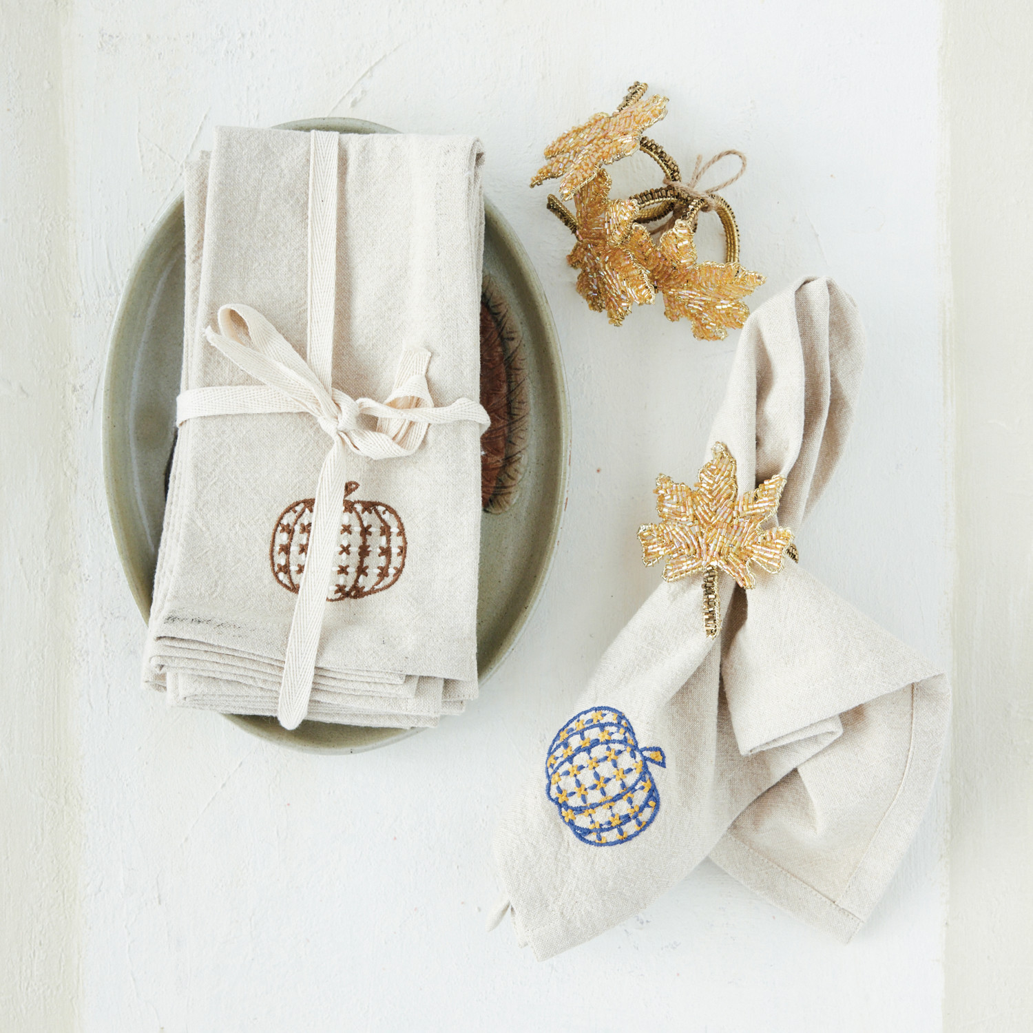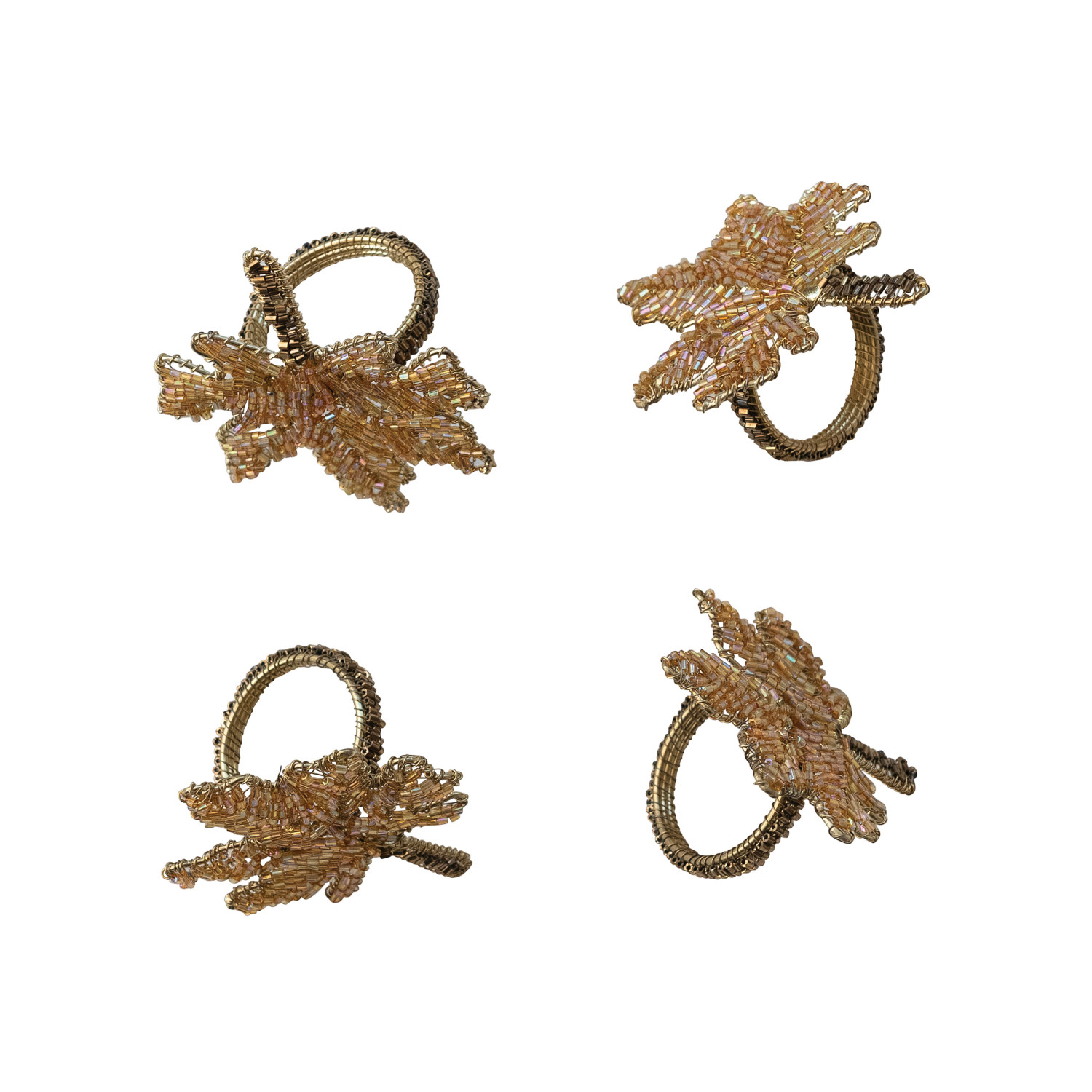 Metal & Glass Beaded Maple Leaf Shaped Napkin Rings, Gold Finish, Set of 4 Tied with Jute