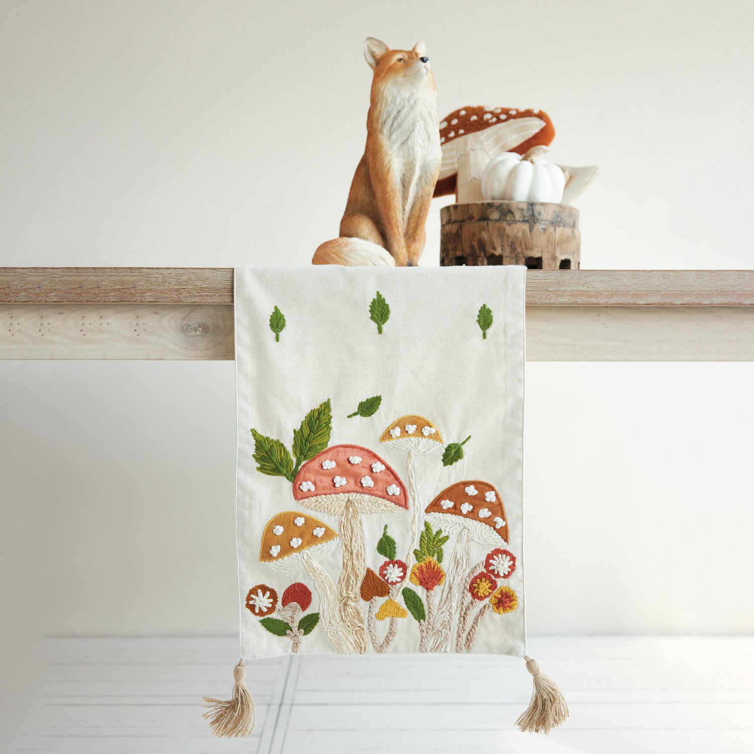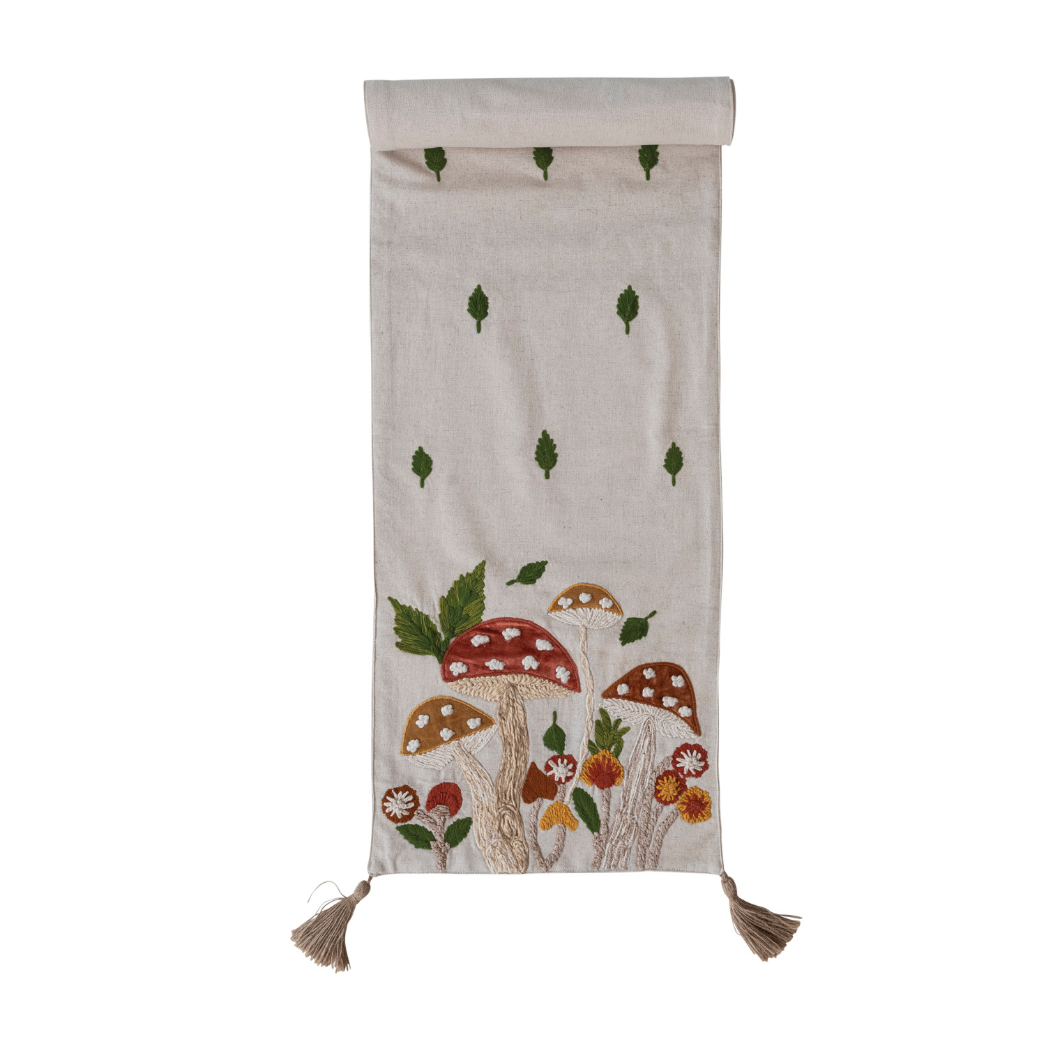 Catalog Name: 72"L x 14"W Cotton & Linen Table Runner w/ Mushrooms, Flowers, Leaves, Embroidery, Applique & Jute Tassels, Multi Color