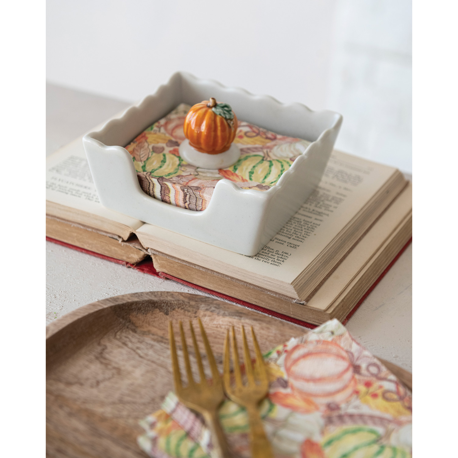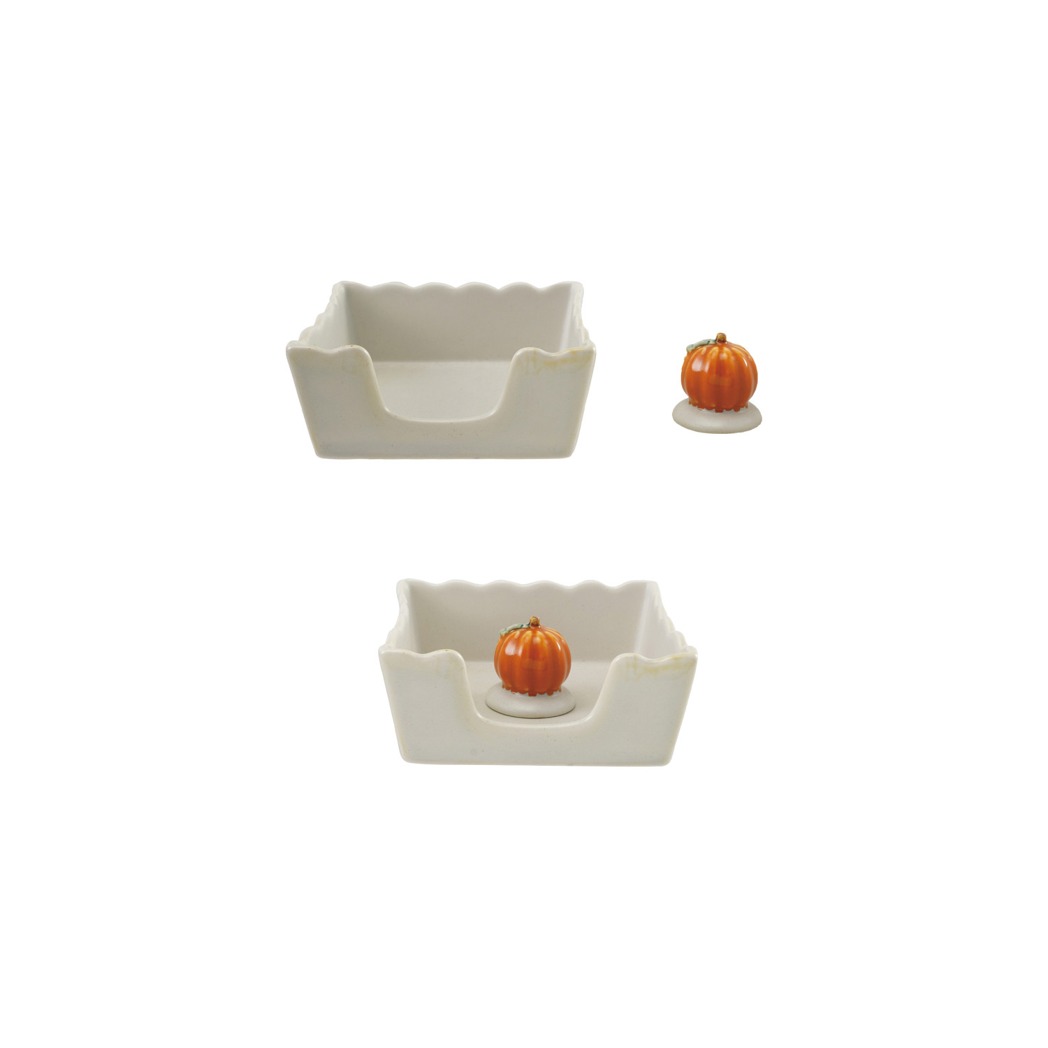 Catalog Name: 5-3/4" Square x 1-3/4"H Stoneware Scalloped Cocktail Napkin Holder w/ Pumpkin Shaped Weight, White, Orange Color & Green, Set of 2 (Holds 4" Square Napkin)