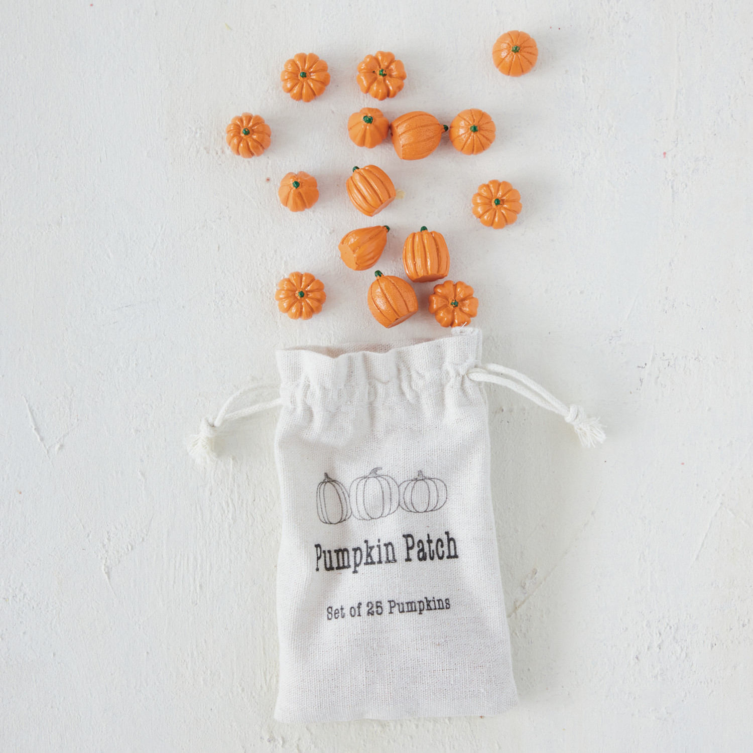 Resin Pumpkins in Printed Drawstring Bag, Orange Color, Set of 25