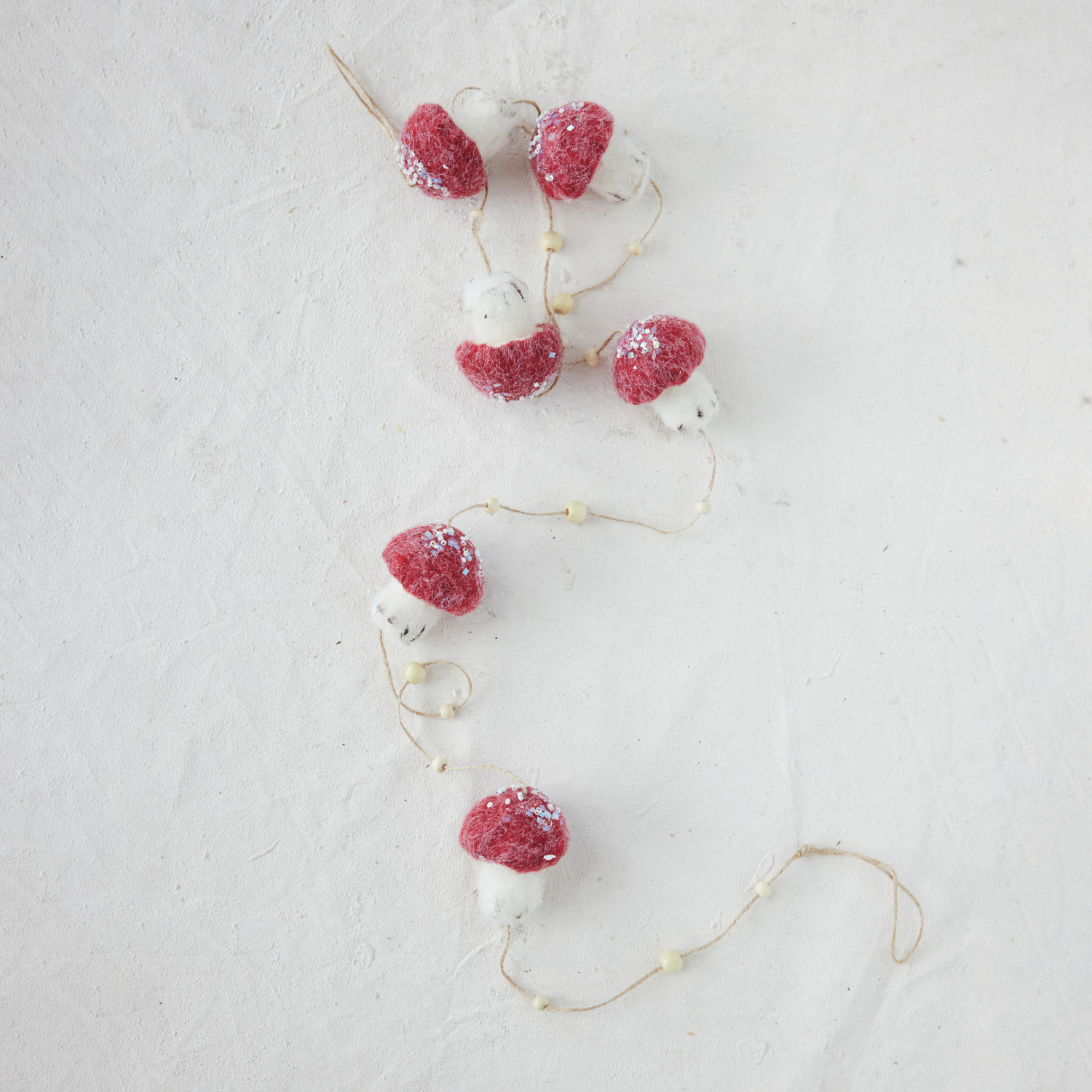 Felt Mushroom Garland with Paulownia Wood Beads & Glitter, Burgundy, White & Natural