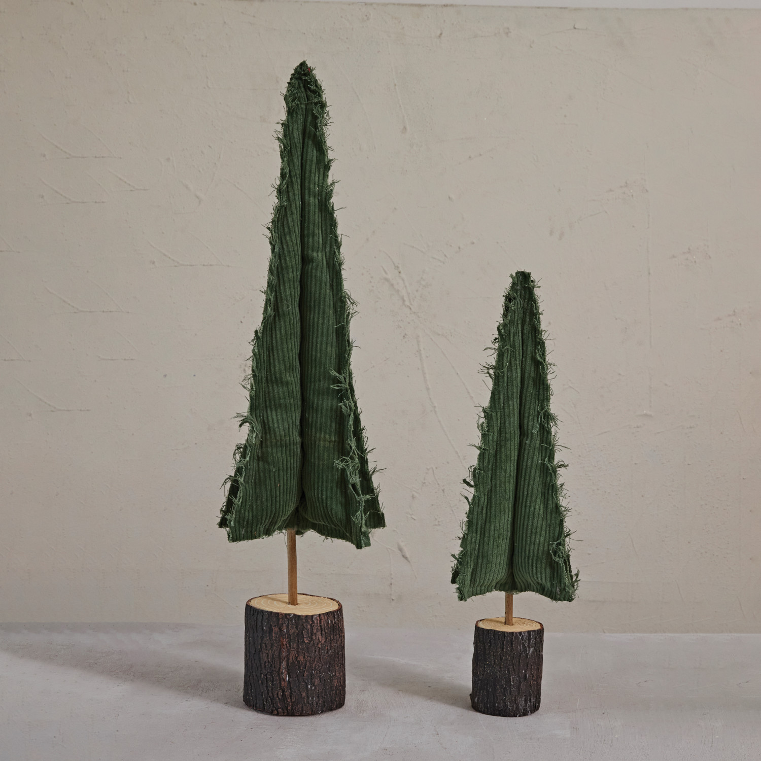 Catalog Name: 8-1/4" Round x 25-1/2"H Raw-Edged Corduroy Tree w/ Wood Slice Base, Green