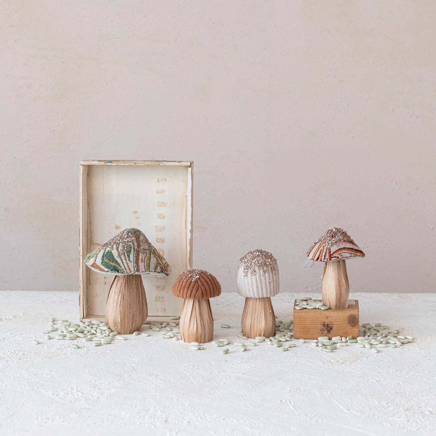 Catalog Name: 4" Round x 5"H, 3" Round x 4-1/4"H, 2-1/4" Round x 4-1/2"H & 2-1/2" Round x 4"H Fabric Topped Foam Mushrooms w/ Wood Base, Sequins & Glitter, Multi Color, Set of 4