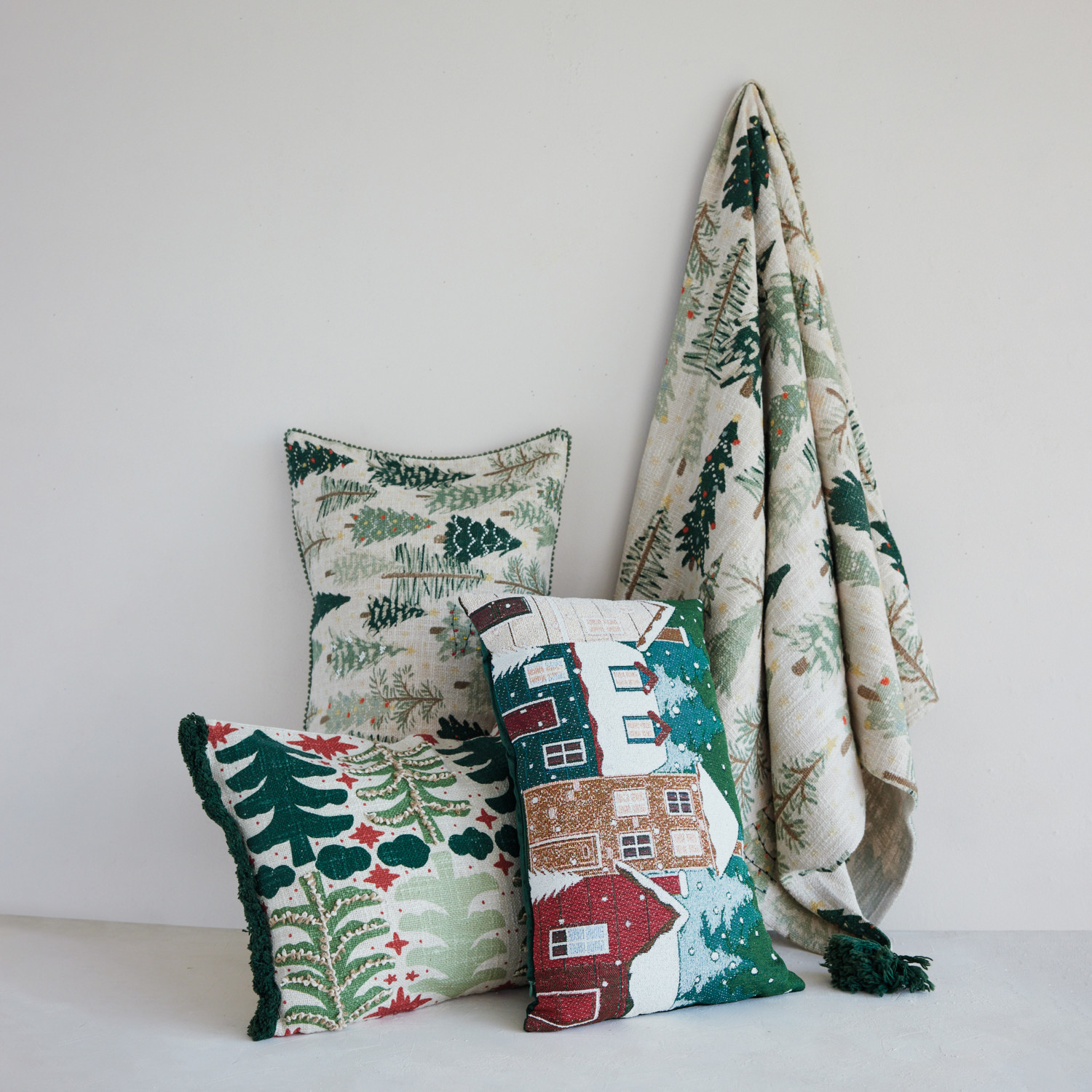 Cotton & Linen Slub Printed Lumbar Pillow with Tree Pattern, Beads & Mini Pom Pom Trim