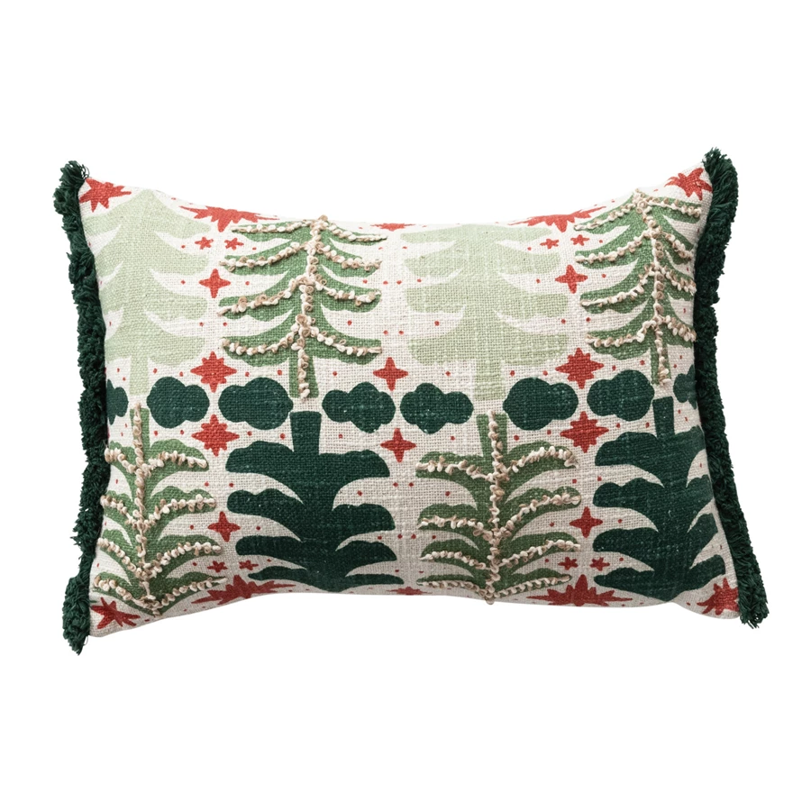 Catalog Name: 20"L x 14"H Cotton Slub Printed Lumbar Pillow w/ Tree Pattern, Embroidery & Tufted Fringe, Multi Color
