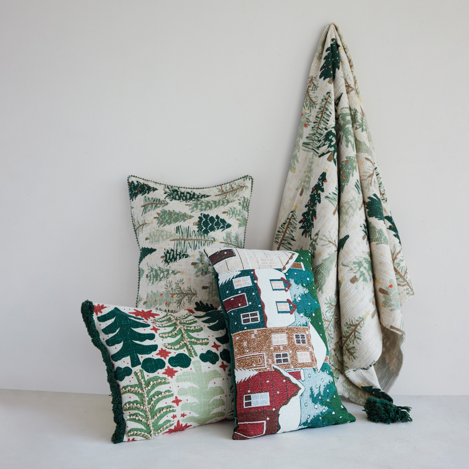 Cotton Slub Printed Lumbar Pillow with Tree Pattern, Embroidery & Tufted Fringe