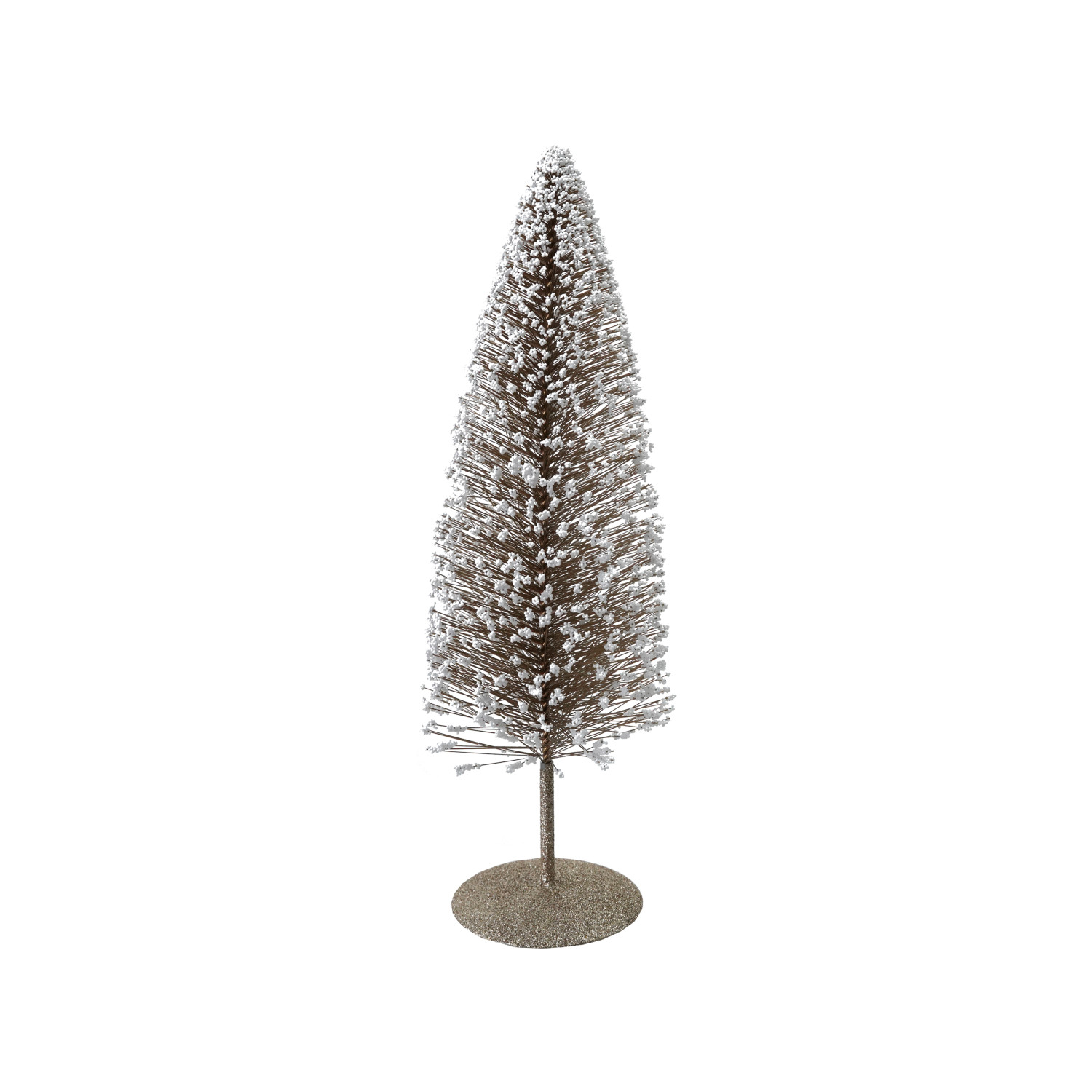 Catalog Name: 4-1/2" Round x 14"H Plastic Bottle Brush Tree w/ Glitter, Foam Microbeads, Snow & Metal Base, Gold Color & White