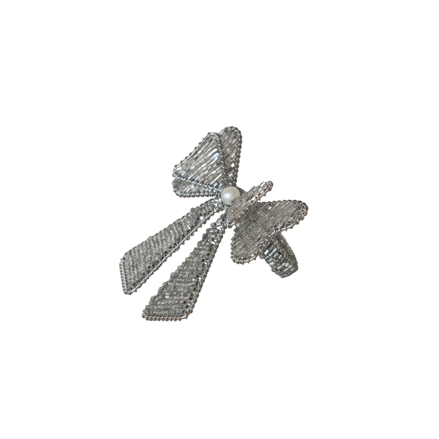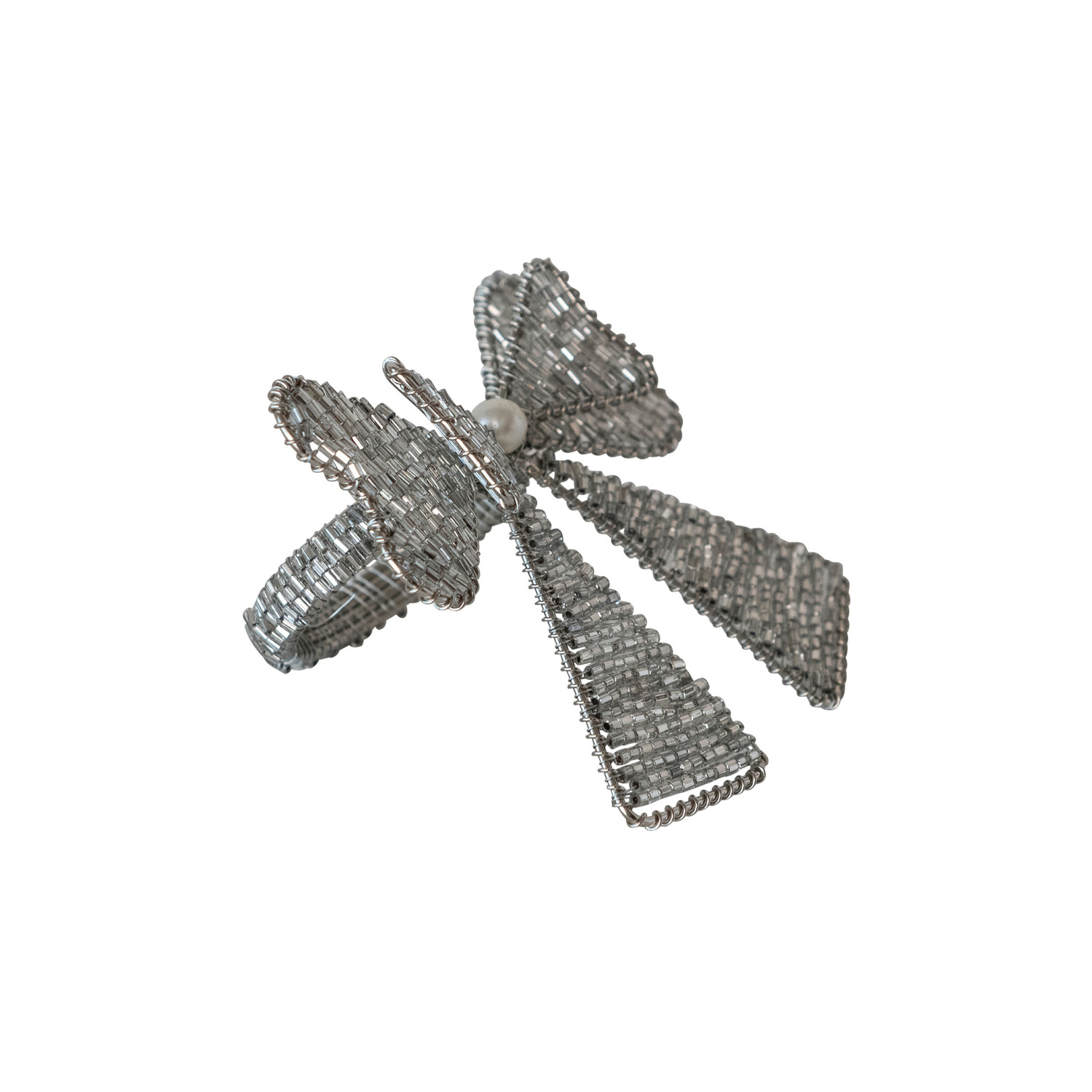 Catalog Name: 3-1/4"L x 2-1/2"W Handmade Metal & Glass Beaded Bow Napkin Rings w/ Faux Pearls, Silver Finish, Set of 4 Tied w/ Silver Cord