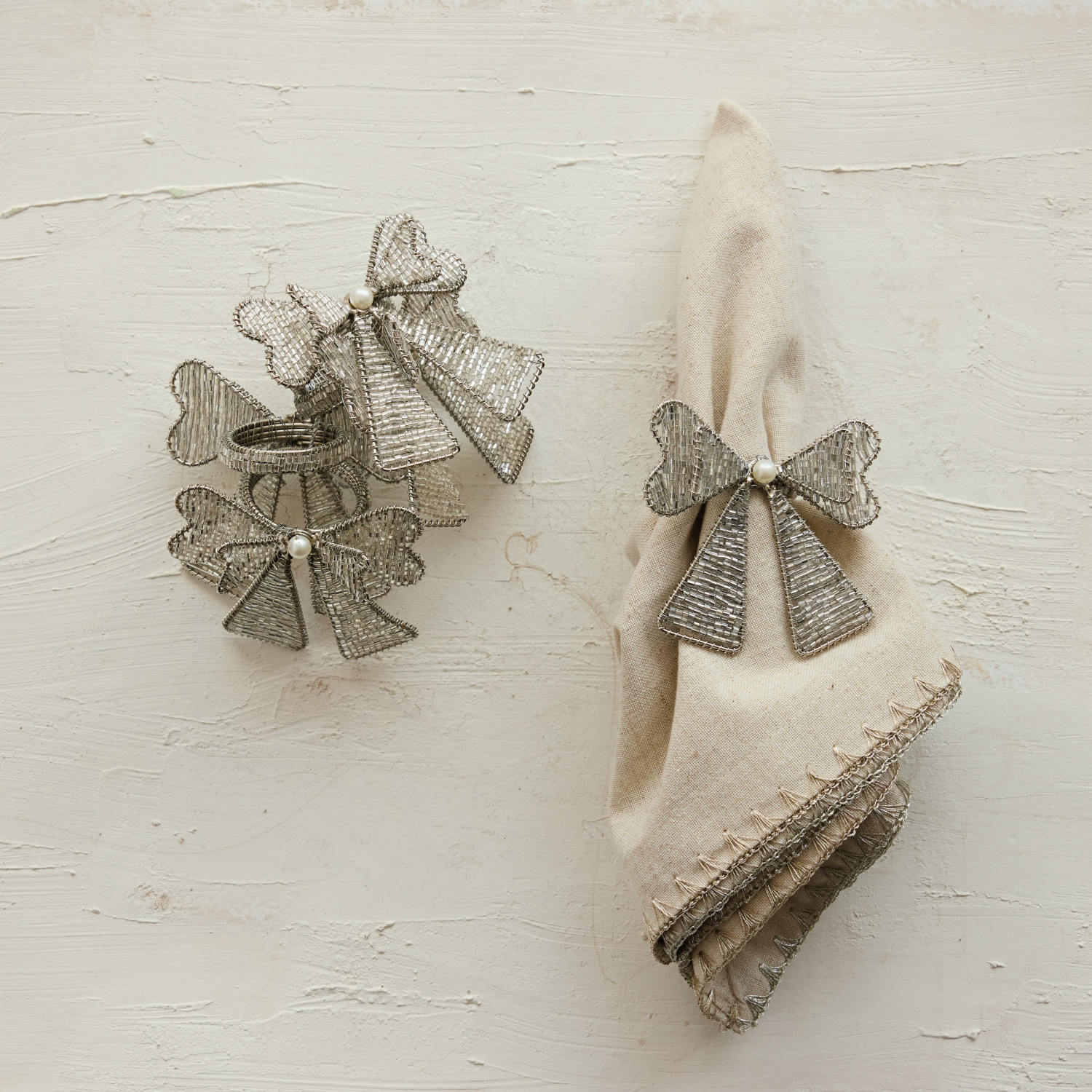 Handmade Metal & Glass Beaded Bow Napkin Rings, Set of 4 Tied with Silver Cord