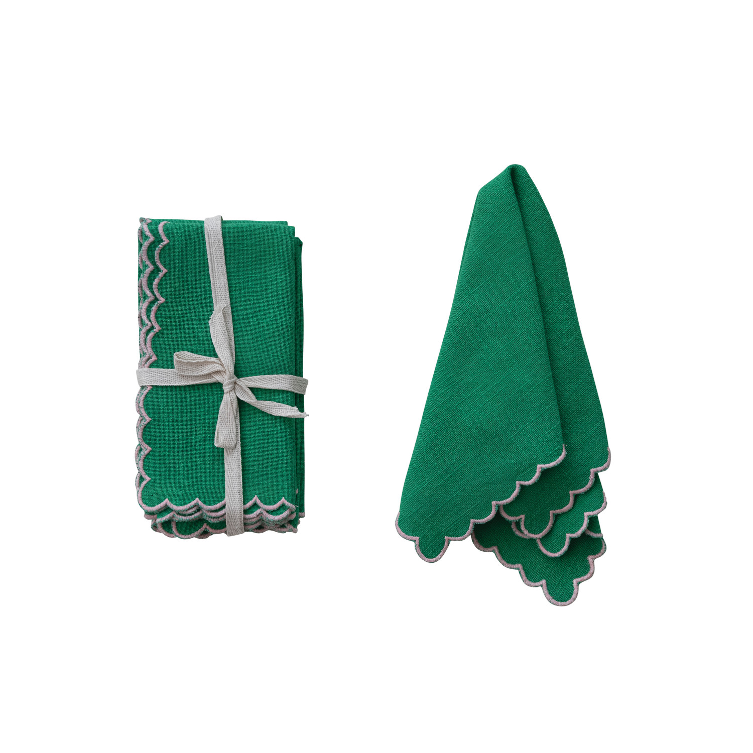 Catalog Name: 18" Square Cotton Scalloped Napkins w/ Contrasting Stitched Edges, Green & Pink, Set of 4 Tied w/ Cotton Tape