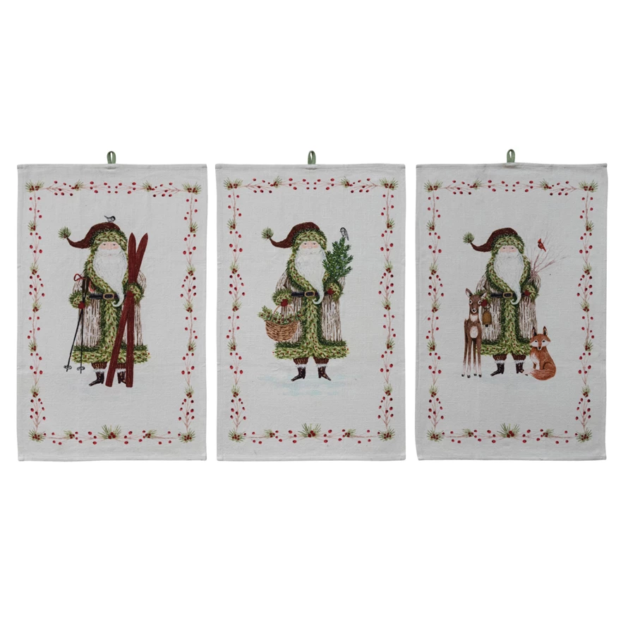 Catalog Name: 28"L x 18"W Cotton Slub Printed Tea Towel w/ Santa & Berries Border, Multi Color, 3 Styles ©