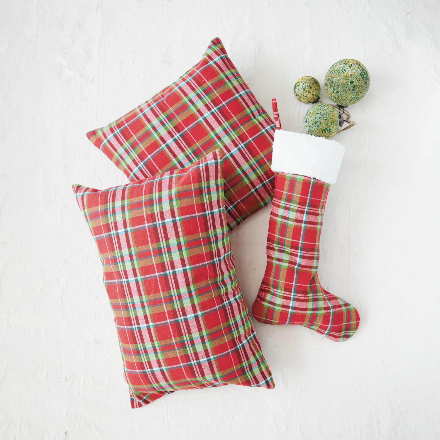18" Square Woven Cotton Pillow with Tartan Plaid Pattern