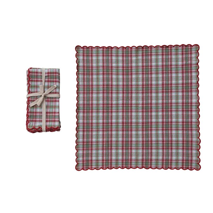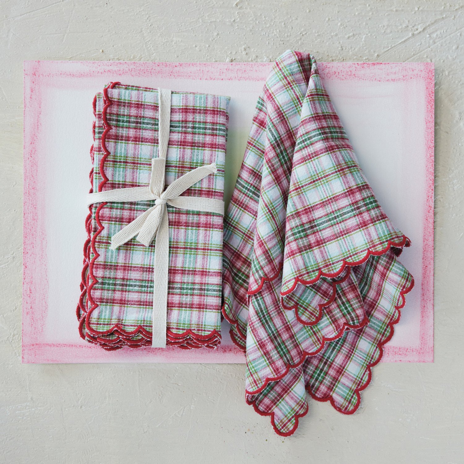 Catalog Name: 18" Square Woven Cotton Scalloped Napkins w/ Plaid Pattern & Stitched Edges, Multi Color, Set of 4 Tied w/ Cotton Tape