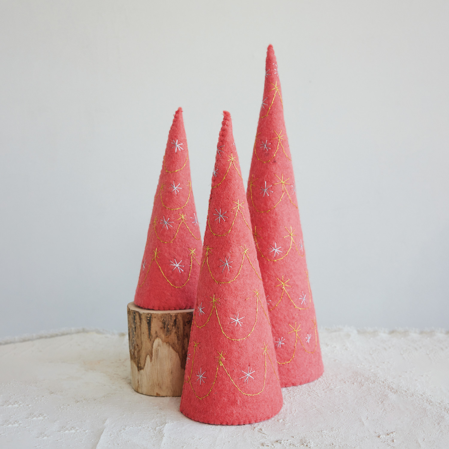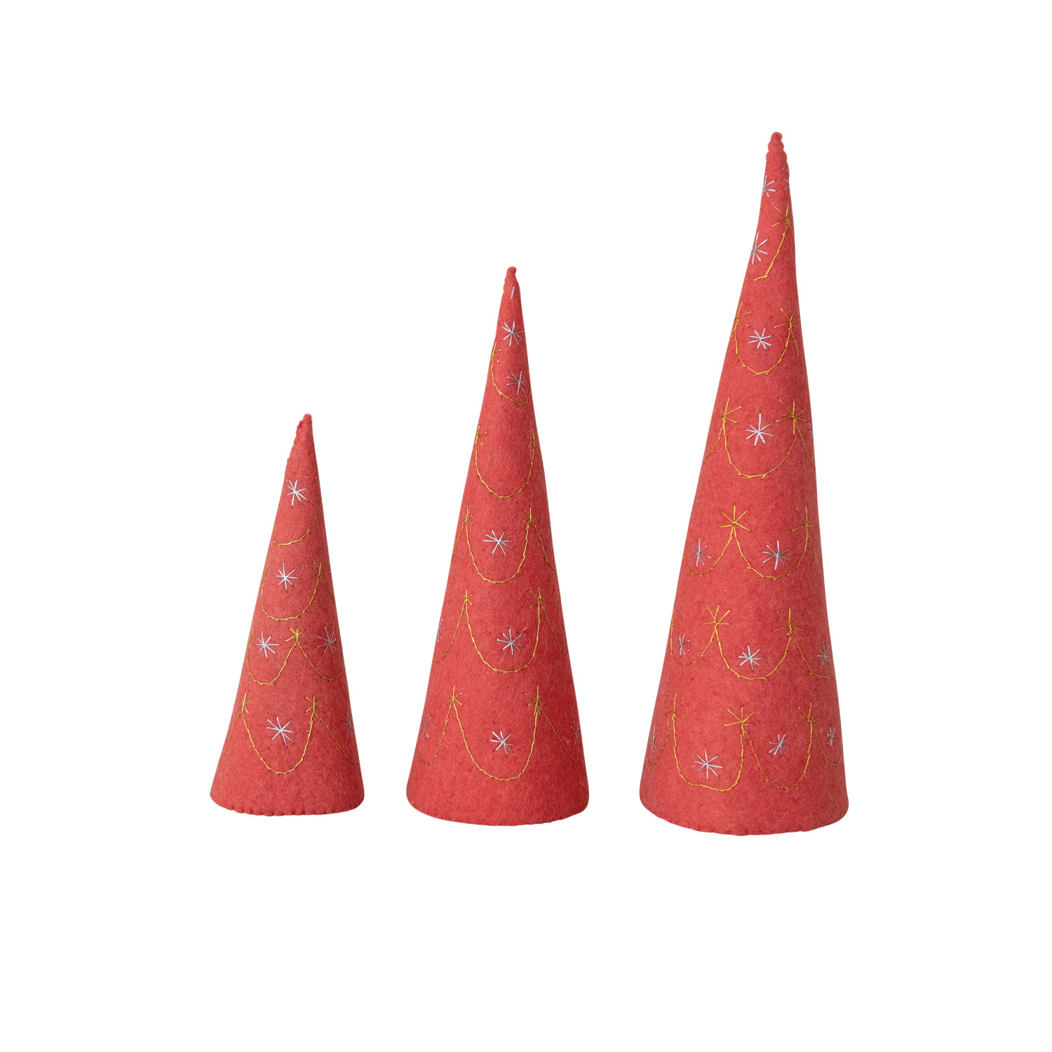 Catalog Name: 5-1/2" Round x 18"H, 4-3/4" Round x 14-1/2"H & 4" Round x 10-1/2"H Handmade Wool Felt Nesting Trees w/ Metallic Gold & Silver Thread Embroidery, Pink, Set of 3