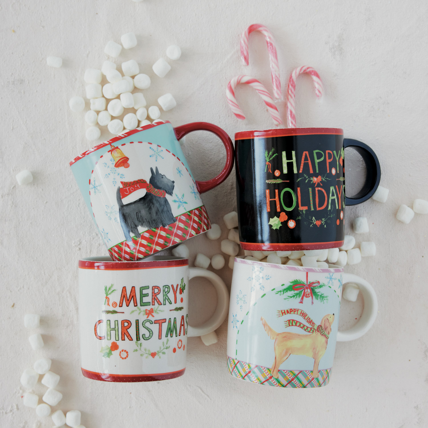 14 oz. Stoneware Mug with Dog in Scarf/Holiday Saying, 4 Styles ©