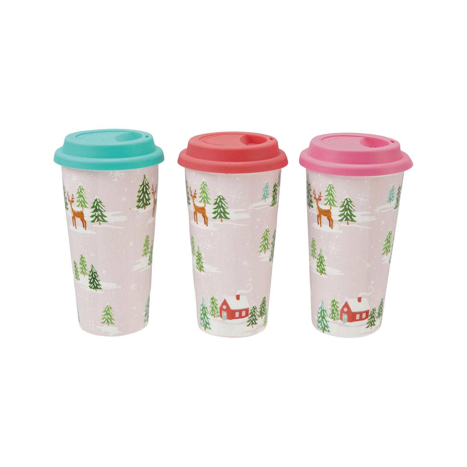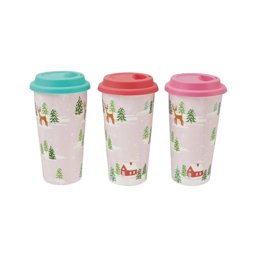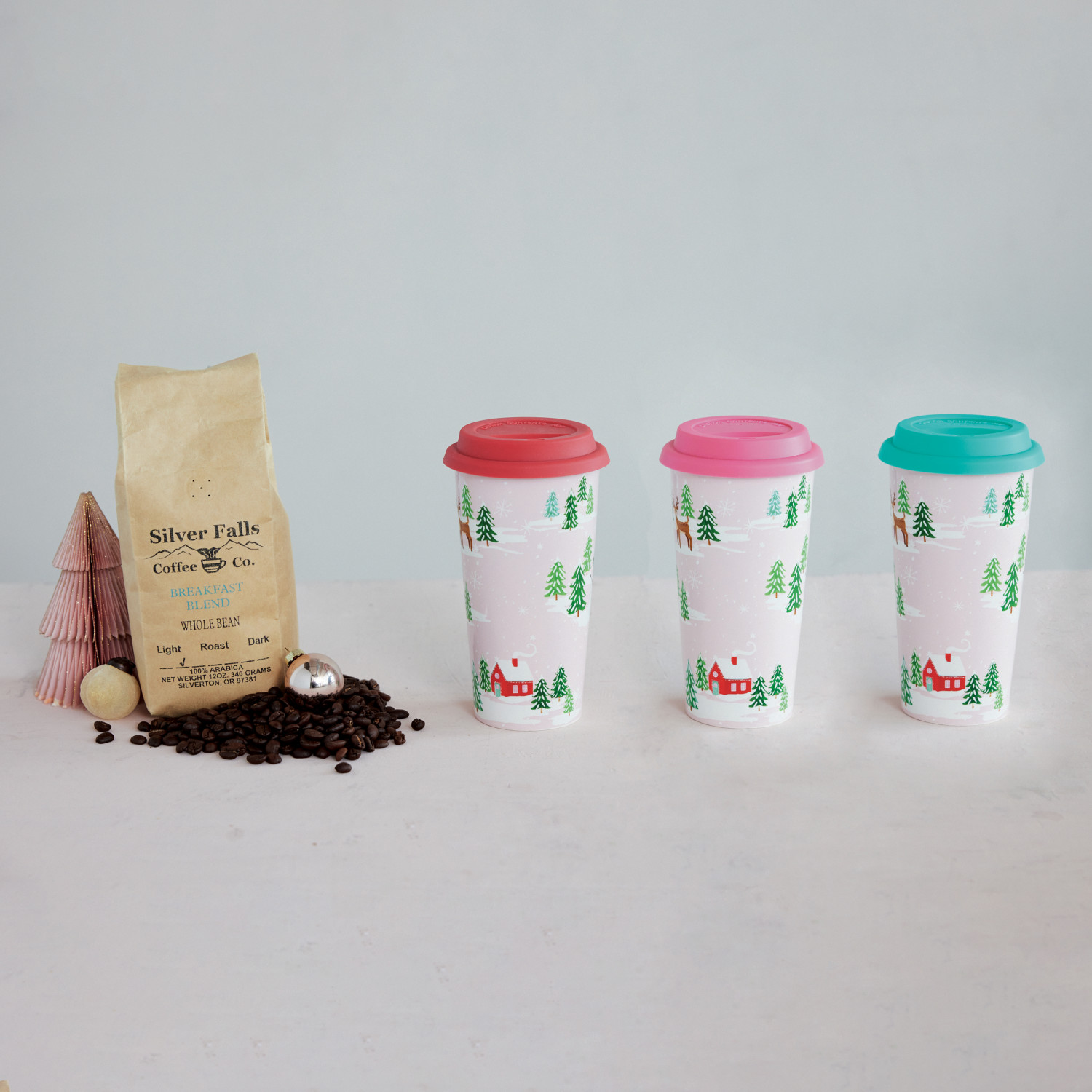 14 oz. Stoneware Travel Mug with Holiday Scene & Silicone Lid, 3 Colors ©